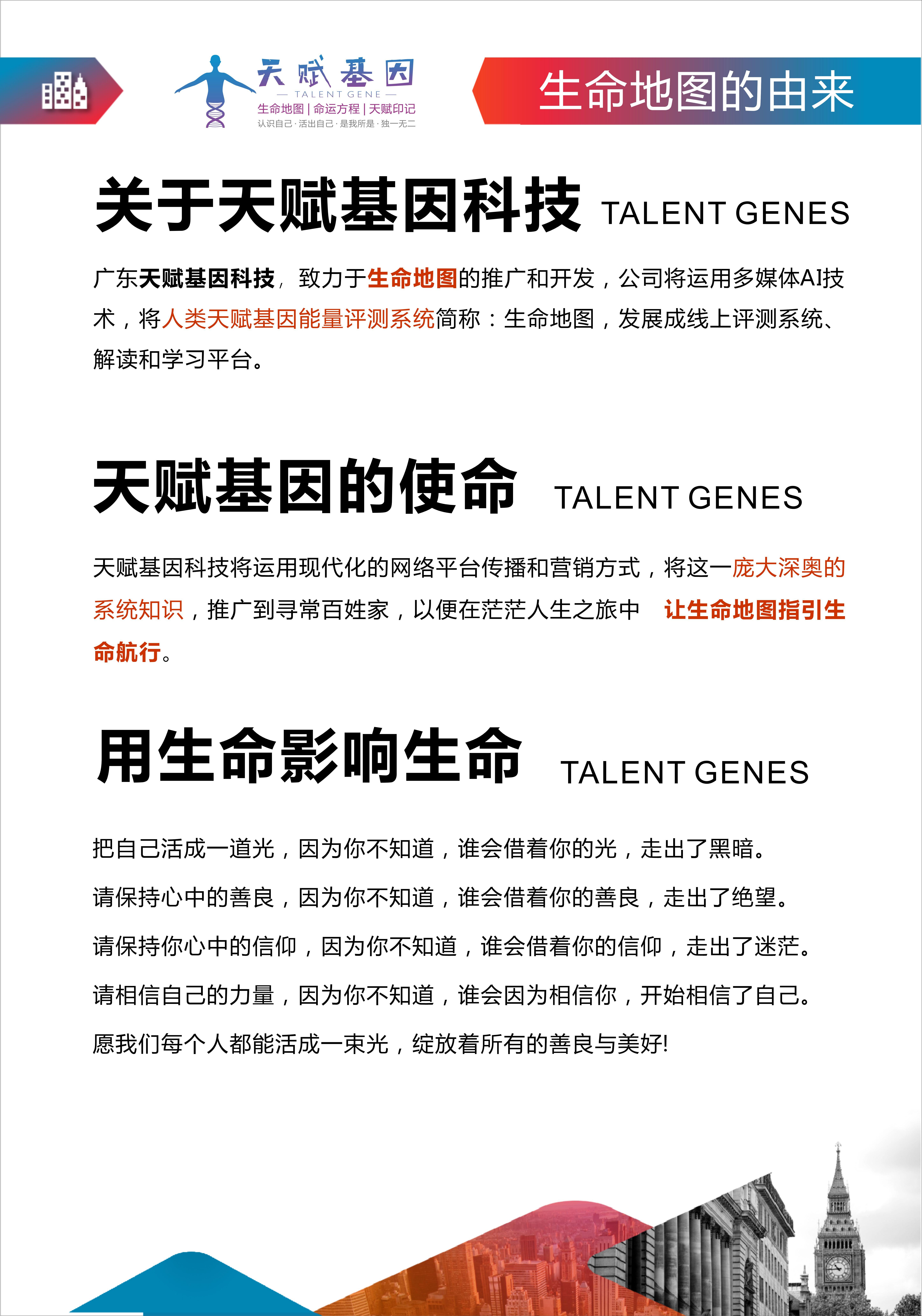 广东天赋基因科技有限公司是国内人类图行业的领军平台,成立于2020年4月,是生命地图(人类图)推广运营平台。其愿景是打造精神产品领域的‘淘宝平台’,使命是让70亿人读懂自己的生命地图,活出天赋使命,过上富而喜悦的人生,核心价值是用生命影响生命,成为点亮他人觉醒之路的火种。