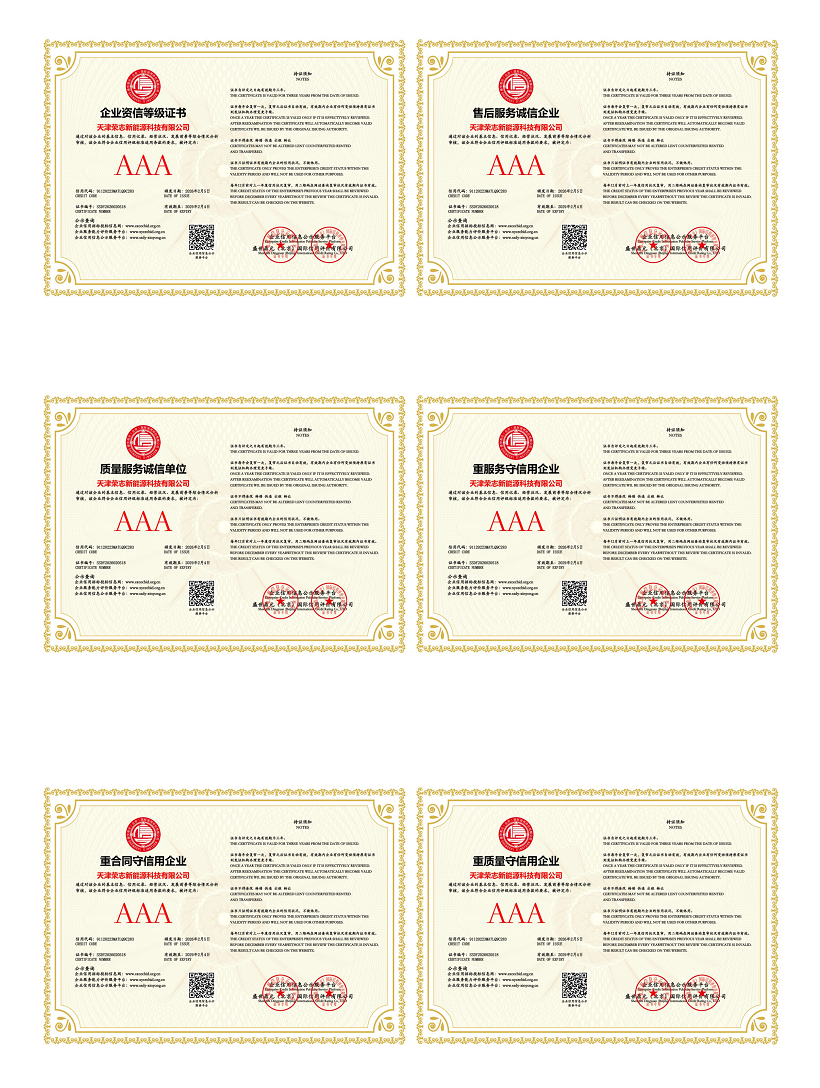 此外,天津荣志新能源科技有限公司深耕新能源领域,凭借严谨的管理体系与卓越的商业信誉,荣获多项权威认证与荣誉。在信用体系方面,获评AAA级信用企业、诚信经营示范单位、重合同守信用企业等多项AAA级信用荣誉,企业法人王晓红女士荣获诚信企业家、诚信经理人称号;管理体系方面,通过ISO 9001质量管理体系、ISO 45001职业健康安全管理体系、ISO 14001环境管理体系三重认证;绿色发展方面,获评招投标领域碳中和承诺示范单位。这些荣誉与资质是荣志新能源品质与信誉的坚实见证,也为客户提供了可靠的合作保障。