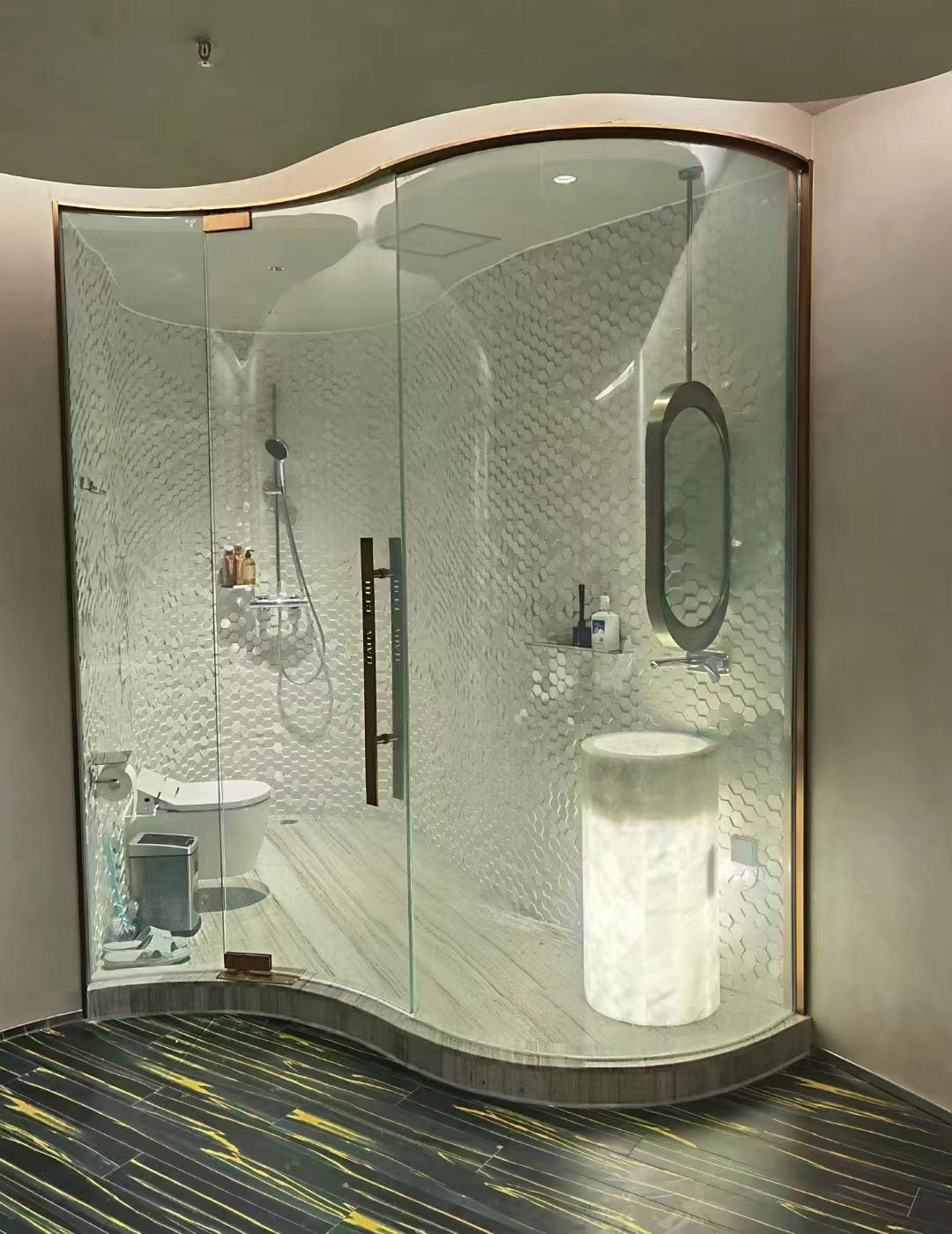 在性能优势上,产品安全可靠,采用夹胶、夹丝、雾化、彩釉、烤漆等工艺,玻璃破碎后仍保持整体性,避免碎片飞溅,具备良好的抗冲击性能。结构稳定,产品经过钢化处理,强度高、耐温差,适用于淋浴房、隔断、幕墙等对安全性要求较高的场所。工艺精细,从裁切、磨边、钢化到图案设计、夹胶夹丝,全部流水线作业,确保每一片玻璃的尺寸精度与表面质量。