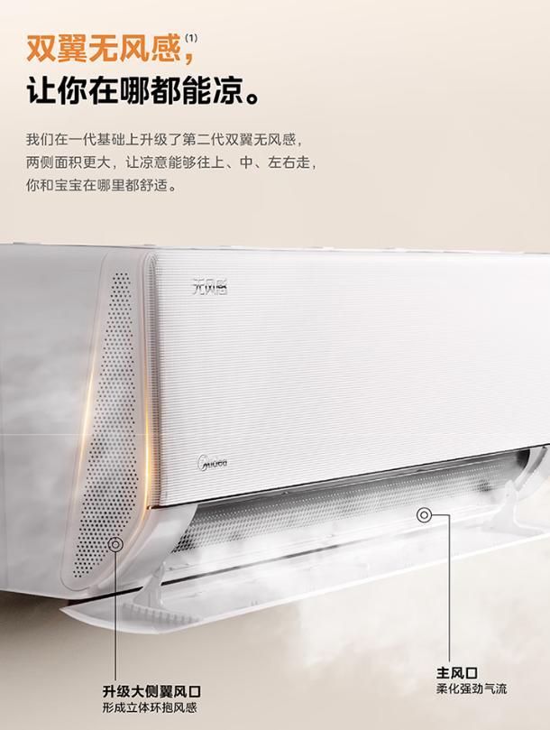 美的无风感・云朵二代的产品功能与卖点也非常吸引人。适配中国母婴体感:0.3m/s舒适风感;二代双翼无风感呵护整夜好眠;卧室风感柔和,宝宝整晚随意翻身;双翼无风感,凉意覆盖广,升级大侧翼风口形成立体环抱风感,主风口柔化强劲气流;全周期专业呵护,一键托管省心便捷;三种模式,匹配你和宝宝的不同阶段,孕期模式专属温和风感,0 - 3岁婴幼模式专属柔和风速,3岁 + 儿童模式专属舒适体感母婴方案一键选择,贴合当下使用需求;四重母婴净护:**重净护抗氧化面板RoHs环保认证,安全抗氧化不易旧;第2重净护纳米抗菌滤网抑制滤网细菌生长和繁殖;第3重净护第五代智清洁56℃高温清洁蒸发器;第4重净护风道热风清洁高温风深度清洁风道内壁。轻音运行,呵护睡眠,低至18dB (A)轻音运行;多类人群敏感友好,全家健康无忧。无风感设计减少冷风刺激,搭配四重净护,减少过敏原,呵护过敏体质人群;暖白柔和,如云温润,双翼机身搭配浅云脂配色,视觉柔和不刺眼;贴心功能:0 - 100档精细控风。