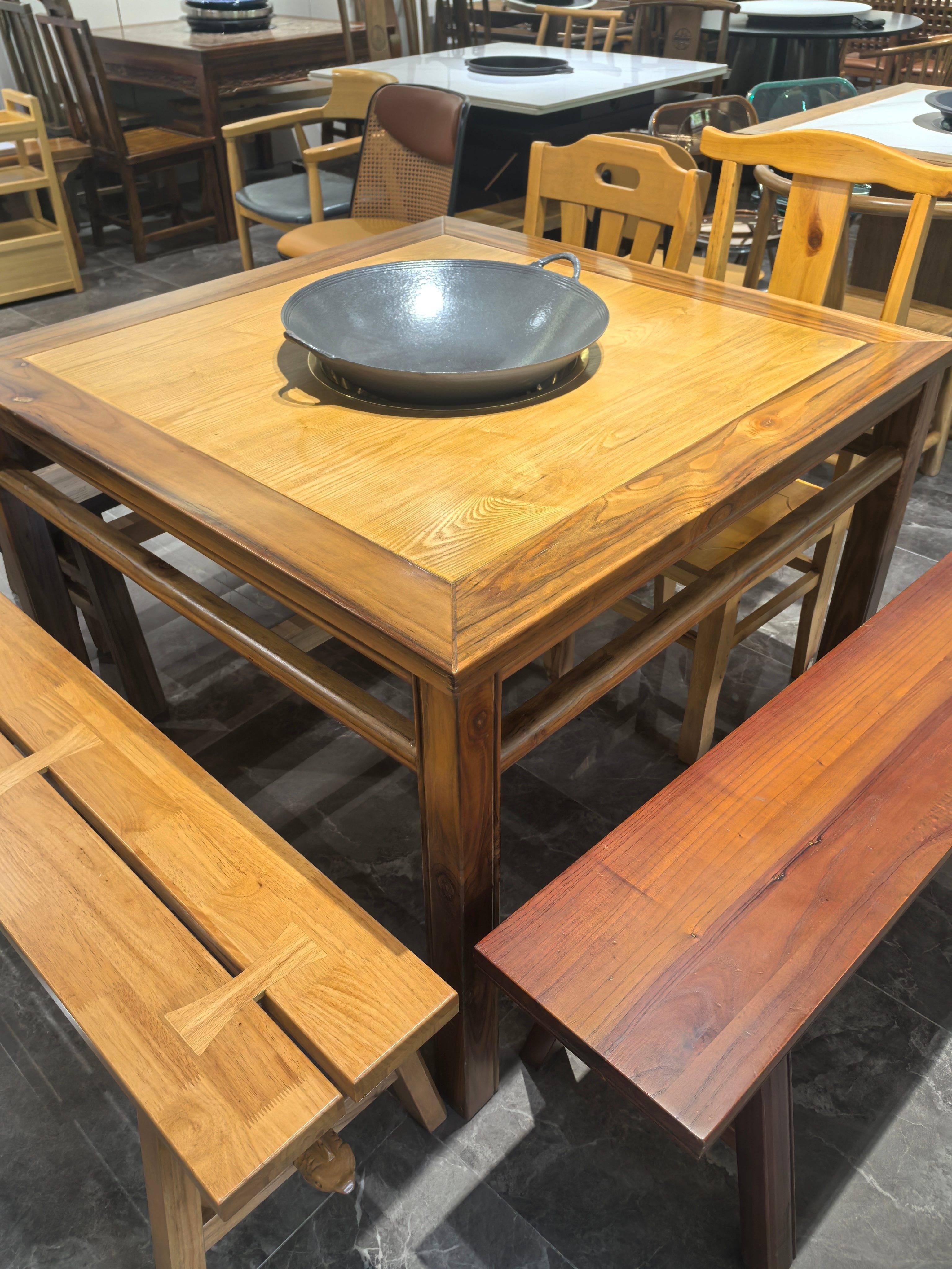 火锅桌椅(新中式,仿古)采用实木 + 大理石嵌入式电磁炉,精准控温(多档调节),桌面承重≥80kg。关键材质与工艺为北美白蜡木等优质实木框架,天然大理石台面,环保水性漆。电磁炉自动断电保护,边角圆润设计,防水防烫处理。