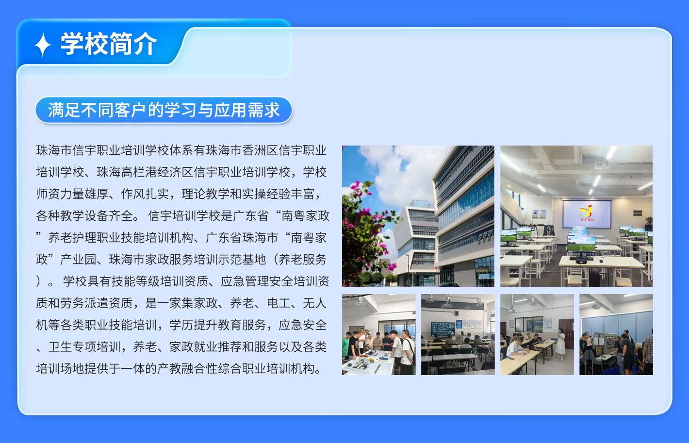 在**方面,2023年珠海信宇教育科技有限公司荣获珠海培训机构杰出成就单位,还被香洲区人社局评为培训机构杰出成就单位,这些**充分证明了该机构的实力和教学质量。