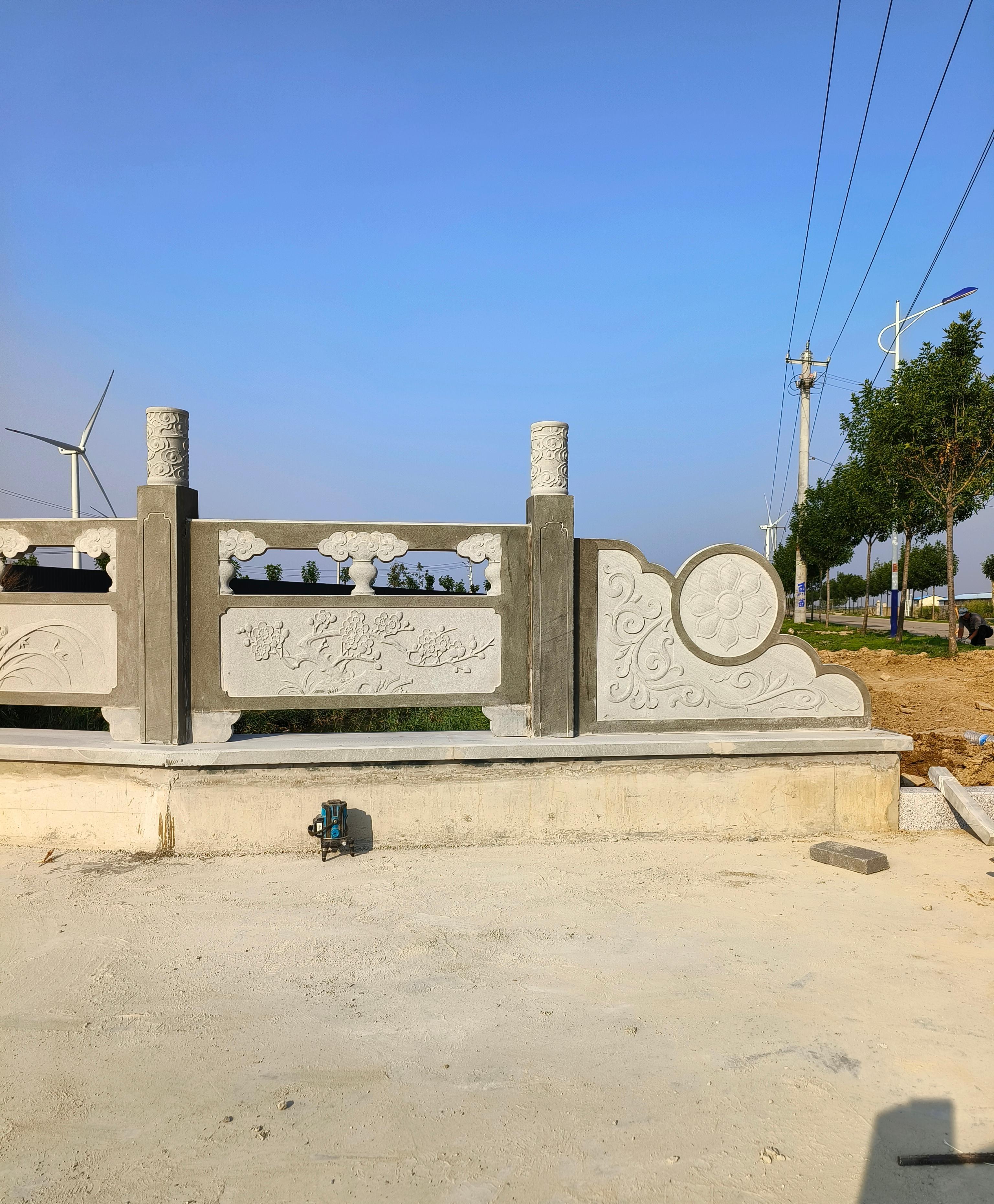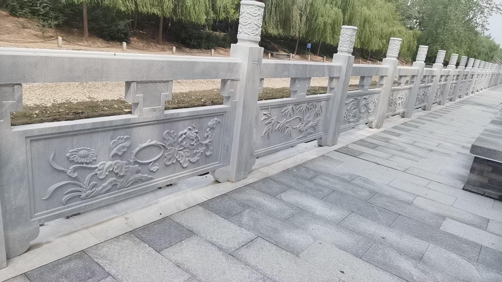 其结构性能也十分出色,产品结构稳固、受力均匀,石栏杆按工程力学设计,抗风压、抗冲击、耐沉降,适用于市政、园林、河道、桥梁、小区等各类场景。耐候性能方面,天然石材密度高、吸水率低,耐风吹、日晒、雨淋、霜冻、酸碱腐蚀,不褪色、不开裂、不变形,户外环境可稳定使用数十年甚至上百年。表面工艺上,表面可做抛光、亚光、荔枝面、火烧面、仿古面等处理,质感自然、色泽温润,清洁维护简单,长期使用依旧保持美观。而且,天然石材无辐射、无污染,符合环保标准,安装后即可投入使用,对人体与环境无害。从原料开采、设计、加工到安装,全程多道质检工序,确保每一件产品工艺达标、结构安全、外观精美,满足工程验收与长期使用要求。