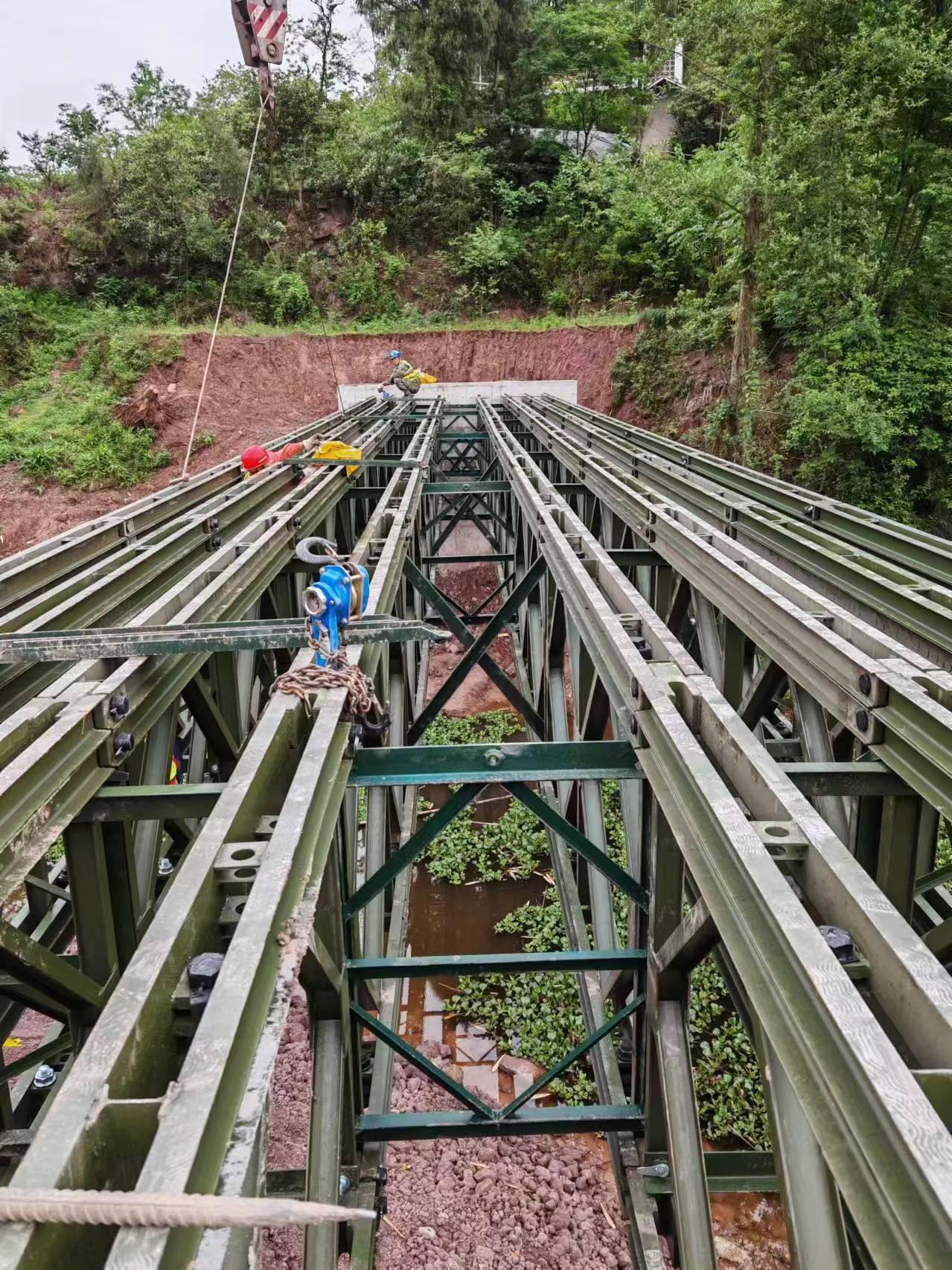 重庆沧顺路桥工程有限公司主营产品具有显著的特点和广泛的用途。贝雷片作为核心构件,采用上下弦杆槽钢双肢组合、竖杆和腹杆工字钢组装而成的桁架结构,选用高强度钢材制造,结构强度高、承载性能稳定,单片自重轻且尺寸统一,互换性强,可通过销轴快速连接,无需大型吊装设备即可完成拆装,大幅提升施工效率。贝雷梁由贝雷片纵横向连接组成,贝雷桁架则通过水平联板、斜向联板等构件加强连接,整体稳定性突出。321型贝雷桥净车道宽3.7米,结构简单、运输便捷,适用于常规荷载需求,HD200型贝雷桥净车道宽可达4.2米,采用接头错开布置和预拱设计,减少非弹性变形,可承载单车60吨荷载,适配特种车辆通行需求,且在用钢量上更具优势。钢便桥、装配式钢便桥采用定型化钢构件组拼而成,可快速装配和拆除,构件运输、储存方便,同时配备整体式抗风拉杆和跨接固定水平支撑架,有效提升整体抗风性和抗侧弯能力,保障使用过程中的稳定性。