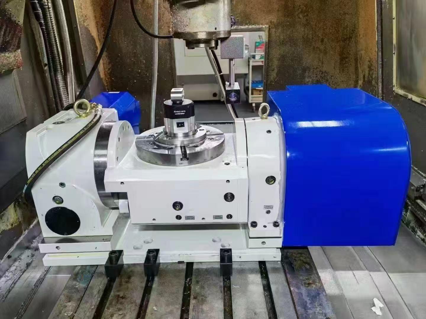 公司的机型有255、320、400、500、630,采用油压式全圆周环抱刹车,刹车力远大于气压式刹车,且可避免转盘偏摆或变形。景晟卧式转台特性突出,油压全圆周环抱刹车设计,锁紧力强,不偏摆。采用高刚性径向轴承,精密结构,耐重切削。卧式转台采用三片式离合齿,分割精度可达±4秒,重复定位精度可达±1秒,齿向接触率可达90%。