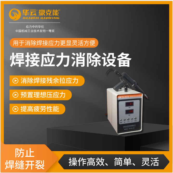 焊接应力消除设备方面,有HY2050通用型豪克能焊接应力消除设备,可消除焊接残余拉应力,预置理想压应力,防止焊缝开裂,提高疲劳性能;HY2050F F系列豪克能焊接应力消除设备,除了消除应力等功能外,还具备焊趾修复,提高疲劳性能更佳,能量可选可控,处理效果更佳,可识别适配多种冲击执行器,故障自检,人机交互等特点;HY4050G G系列豪克能焊接应力消除设备,处理密度更大,效率更高,能量输出更加稳定、可靠,焊趾焊缝精准修复,提高疲劳性能更佳,可识别适配多种冲击执行器和人机交互功能;HYrobot豪克能应力调控专用机器人,全角度、全方位、效率高,冲击痕均匀一致,金属表面形貌好,处理效果优于人工处理,是豪克能焊接应力消除技术与工业机器人的结合,适应于智能化工业生产。