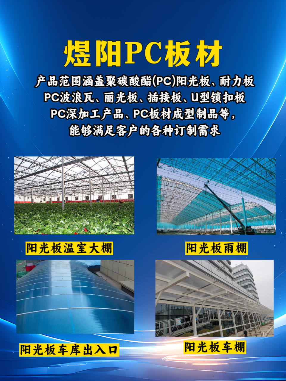 该公司主营聚碳酸酯(PC)阳光板、耐力板、波浪瓦、丽光板、插接板、U型锁扣板、PC采光罩等建筑板材的生产与加工服务。旗下拥有“煜阳阳光”“津亮”等品牌。其产品种类丰富多样,PC阳光板包括双层阳光板、三层阳光板、四层阳光板、蜂窝阳光板、米字阳光板等;PC耐力板有通用耐力板、磨砂耐力板、钻石耐力板、荔枝耐力板等;PC瓦板包含丽光板、角浪瓦、波浪瓦、T型瓦、840中空瓦等;U型锁扣板有600mm宽四层6 - 12mm锁扣板、1050mm宽四层8 - 14mm锁扣板、1050mm宽八层16 - 30mm锁扣板等;插接板为八层插接板500mm宽30mm - 50mm;还提供PC板材深加工,如PC板打孔折弯、PC板热成型、PC采光罩等。
