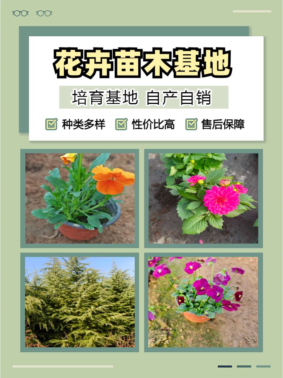 其草花系列包含垂钓牵牛、矮牵牛、三色堇、一串红、万寿菊、彩叶草、鸡冠花、百日草、金盏菊、翠菊、太阳花、国庆菊、孔雀草、四季海棠、非洲凤仙、金叶薯、长春花、夏瑾、五色草、鼠尾草、波斯菊、羽衣甘蓝、红叶甜菜等几十种花卉。宿根系列有金娃娃萱草、金鸡菊、荷兰菊、天人菊、松果菊、地被菊、蛇鞭菊、蛇莓、羽扇豆、福禄考、玉簪、鸢尾、月季、薰衣草、鼠尾草、八宝景天、三七景天、红景天、假龙头、千屈菜、马兰、石竹、醡浆草、美人蕉、五叶地锦、三叶地锦等。绿化苗木方面,有金叶女贞、红叶小蘖、瓜子黄杨、冬青、卫矛、北海道黄杨、红瑞木、龙柏、花石榴、蜀松、红王子锦带、连翘、木槿、迎春、红叶石楠、紫叶李、紫荆、紫薇、樱花、碧桃、垂柳、法桐、国槐等。观赏竹系列涵盖早园竹、刚竹、淡竹、金镶玉、丛生竹、紫竹、玉镶金、琴丝竹、黄金竹等。水生系列包括荷花、睡莲、碗莲、水生鸢尾、千屈菜、再力花、水生玉带草、梭鱼草、香蒲等。