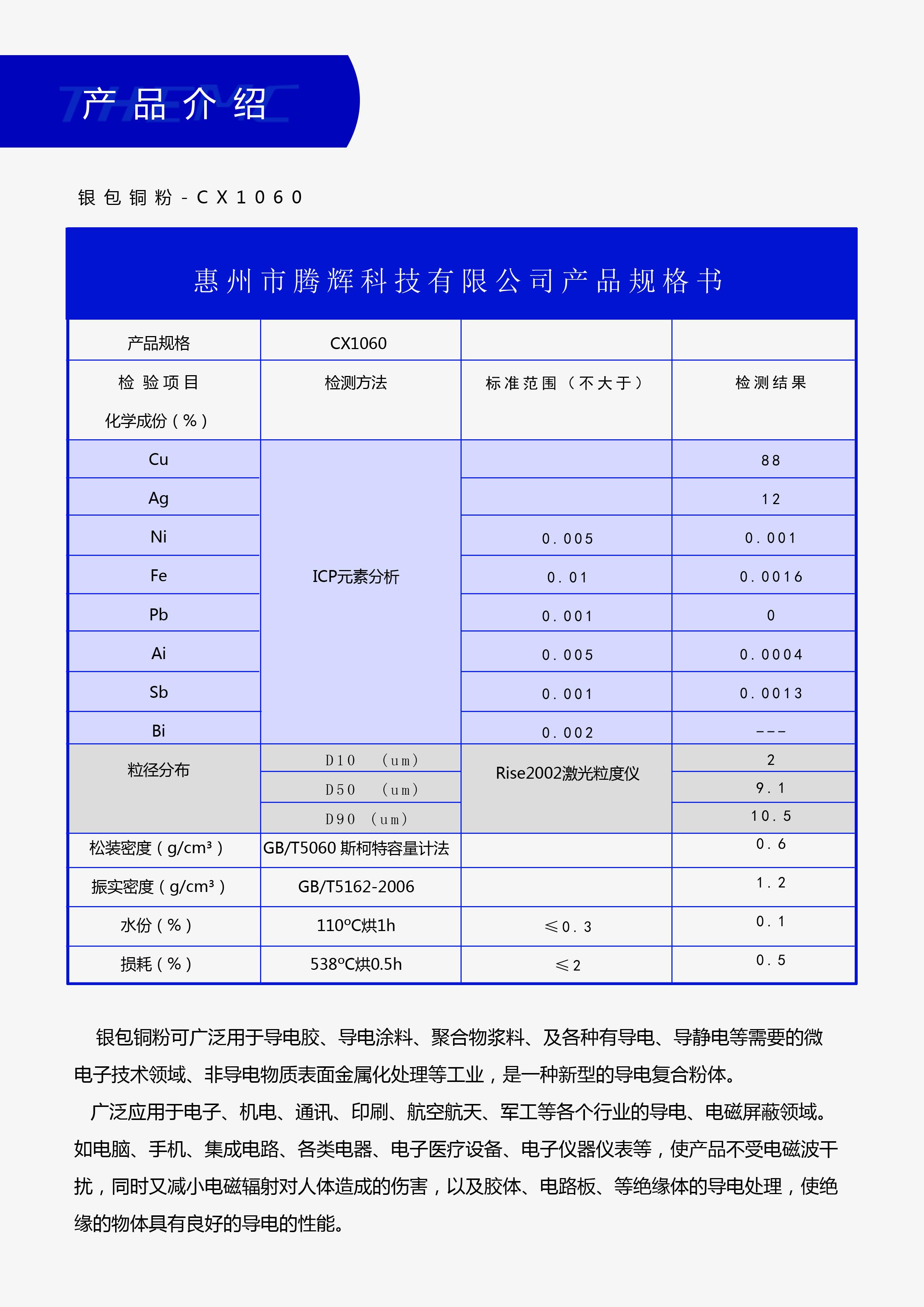 镀银铜粉(银包铜导电粉体)方面,片状/球状镀银铜粉作为一种能与传统纯银粉性能相当的新型高导电材料,将其添加于涂料(油漆)、胶(粘合剂)、油墨、聚合物料浆、塑料、橡胶等中,可制成各种导电、电磁屏蔽等制品,广泛应用于电子、机电、通讯、印刷等各个工业部门的导电、电磁屏蔽等领域。像电脑、手机、电子医疗设备、电子仪器仪表等电子、电工、通讯产品的导电、电磁屏蔽都能看到其身影。