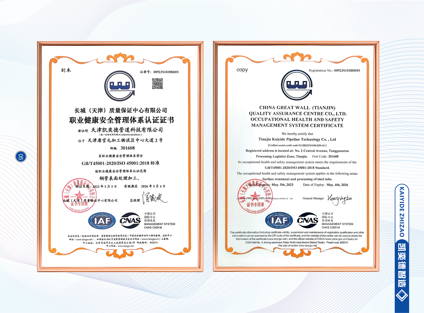 在售后服务方面,天津凯奕德管道科技有限公司拥有一支集技术与销售为一体的、年轻而富有朝气的团队。有专业的销售工程师提供整套解决方案,并拥有一套成熟的现代化管理体制。从产品的生产、配送到安装、调试以及售后都有完整的一条龙服务体系。公司与中石油、中石化、中国水务、中国燃气、雄安新区、友发钢管、京华制管、正大制管等单位均有良好的合作关系。公司始终秉承“诚信经营”的方针,坚持“以人为本”,遵循“以规模求效益,以质量求生存”的经营原则,始终坚持以客户的需求和满意为核心,以诚信为宗旨,竭诚为广大新老顾客创造优质的产品,提供完善的服务。