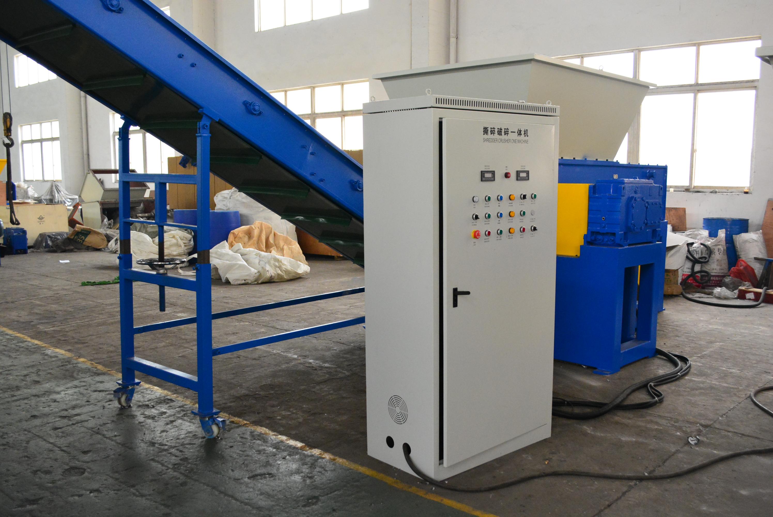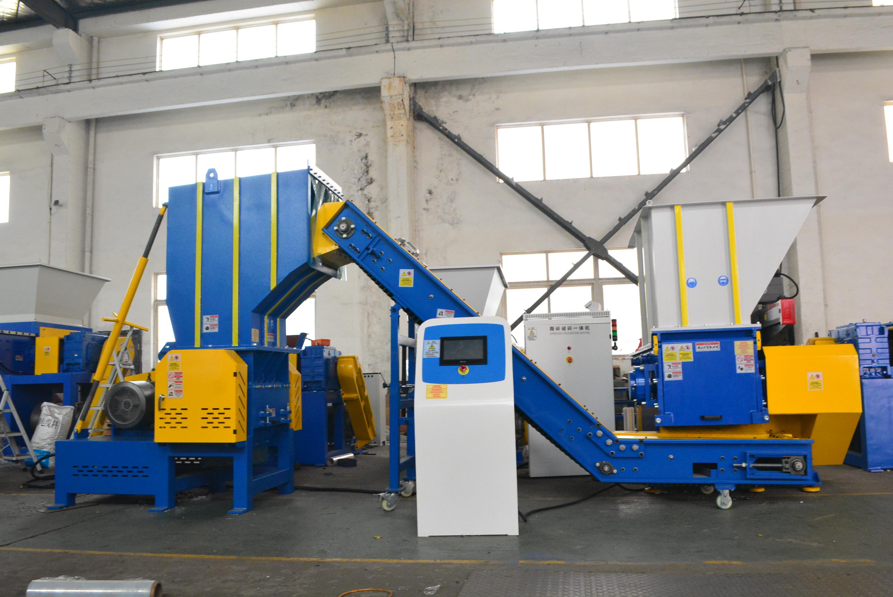 核心性能上,设备具有低转速高扭矩的特点,单/双轴机型转速50–80 rpm,扭矩大、破碎力强,适合大块/厚壁/韧性物料。主流机型(如XR800/XRS800)处理塑料、木材、工业垃圾时,产能稳定、能耗低,出料颗粒尺寸可通过筛网定制,可达20 mm,满足再生料要求。刀具方面,动刀为4面刃口,磨损后旋转90°再用;定刀2面刃口,旋转180°复用,大幅降低刀具成本。动刀呈V型安装,切料均匀、降低能耗与噪音、提升效率。独立液压系统的液压推料,速度可调、推力大,适配大捆/大块/难进料物料。并且提供焊接/整体/可拆卸三种刀座,适配不同工况与维护需求。设备运行时噪音低、扬尘少,采用PLC全自动控制,一键启停、自动正反转、故障报警,操作简单、节省人工,覆盖塑料、橡胶、木材、金属、工业垃圾、电缆、管材等50 + 种物料,支持非标定制。