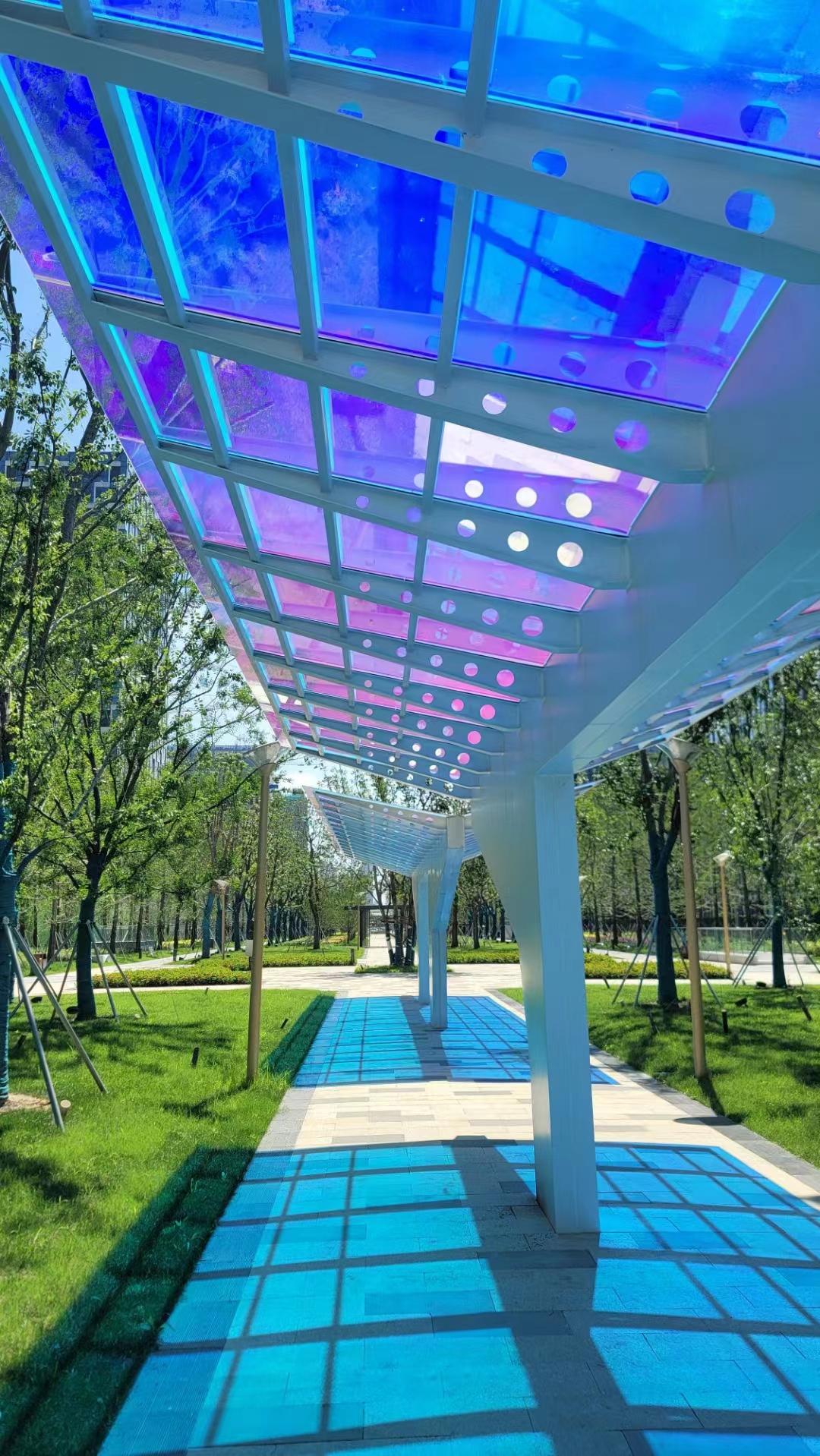 变色与炫彩系列里,幻彩玻璃表面镀覆多层金属氧化物薄膜,光线照射下呈现多彩变幻;渐变玻璃通过丝网印刷或数码打印,形成色彩自然过渡效果;炫彩玻璃利用光的干涉效应,呈现绚丽多彩的视觉效果;变色玻璃随光线角度或温度变化呈现不同色彩;彩色玻璃玻璃本体着色或表面镀色,色彩均匀饱满;调光玻璃液晶调光膜夹入玻璃,通电透明、断电雾化;雾化玻璃通过电控或贴膜实现雾化效果,保护隐私;雾化调光玻璃兼具调光与雾化功能,可自由切换透明与隐私模式。