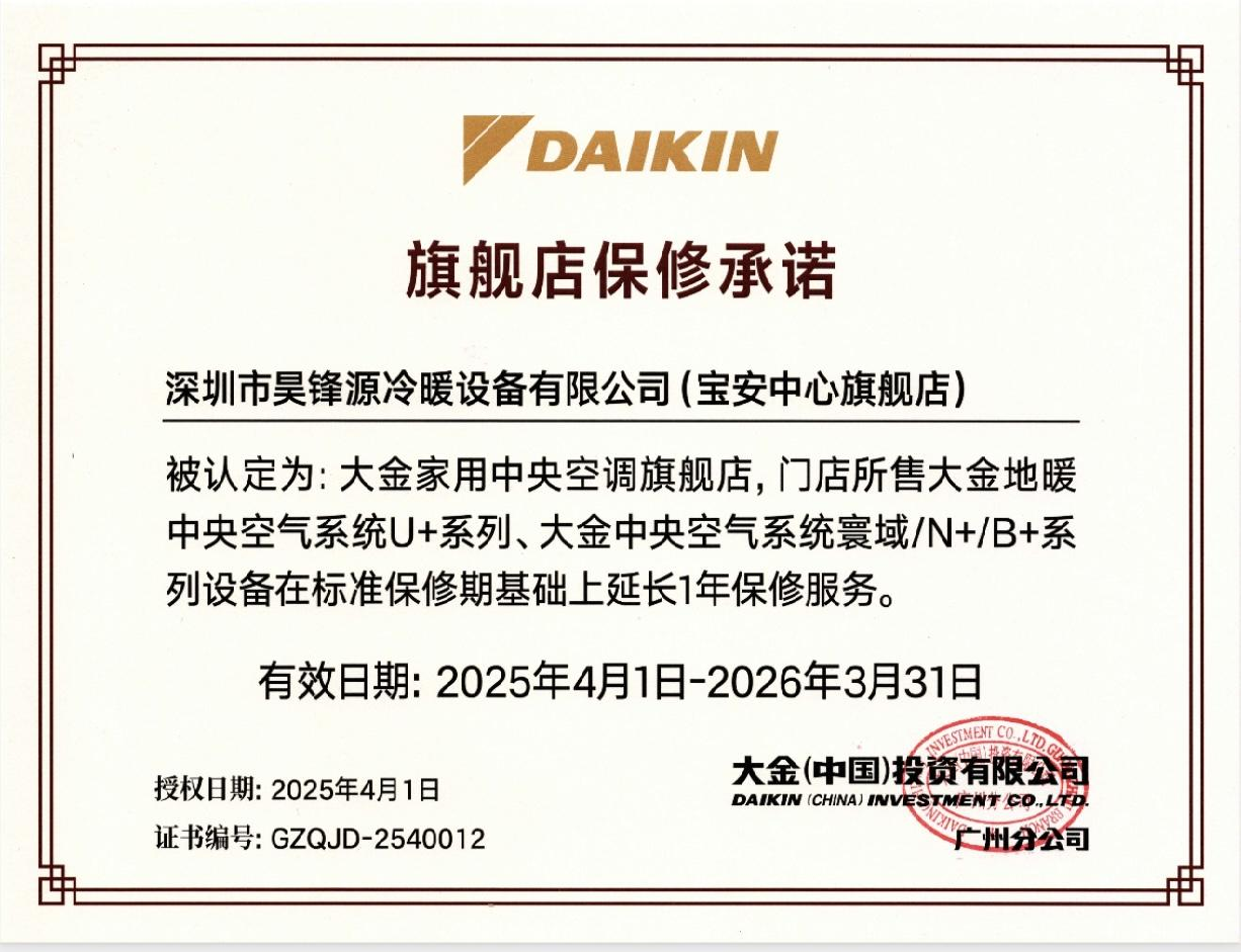 深圳市昊锋源冷暖设备有限公司总部位于深圳前海中心,旗下设有宝安分公司、南山分公司、沙井分公司和龙岗分公司。关联大金空调的深圳市昊承机电工程有限公司为大金专业安装及售后服务公司。该公司是大金空调在深圳地区授权的特许经销商、专业安装公司以及售后服务中心,是一家具备厂家售前、施工安装、售后服务为一体的综合性服务企业。