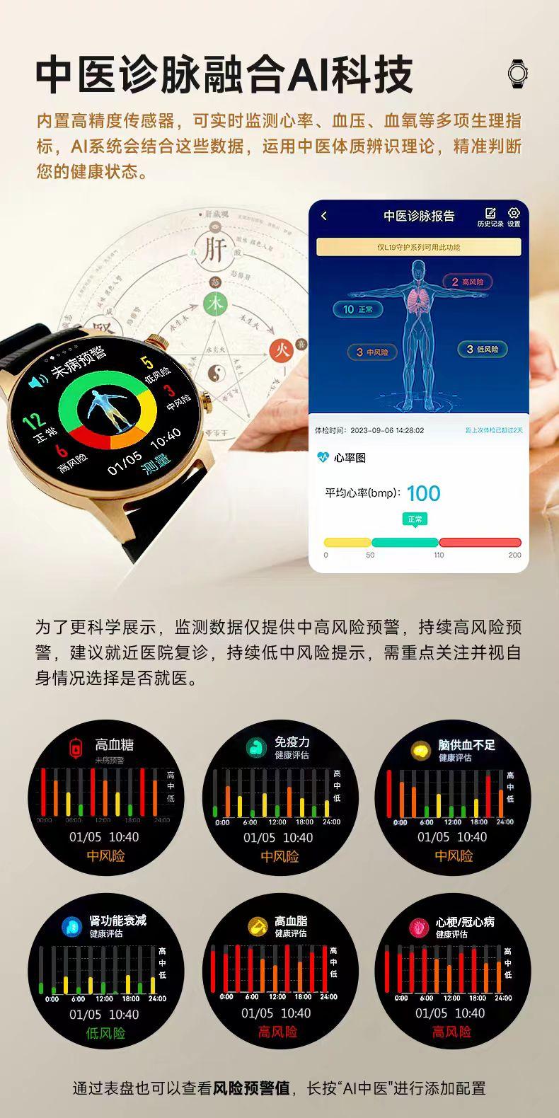 该手表的 AI 中医预警能力强大,能实现 15 项动态风险预警,如心梗、脑供血不足、血压/血糖/血脂趋势、肾功能减退、胃动力不足、咽炎、睡眠呼吸暂停倾向、9 种中医体质辨识等,预警响应 ≤1 秒触发报警并推送定位 + 照片。此外,还具备跌倒检测(误报率<10%)、SOS 一键求救、电子围栏等安全功能。