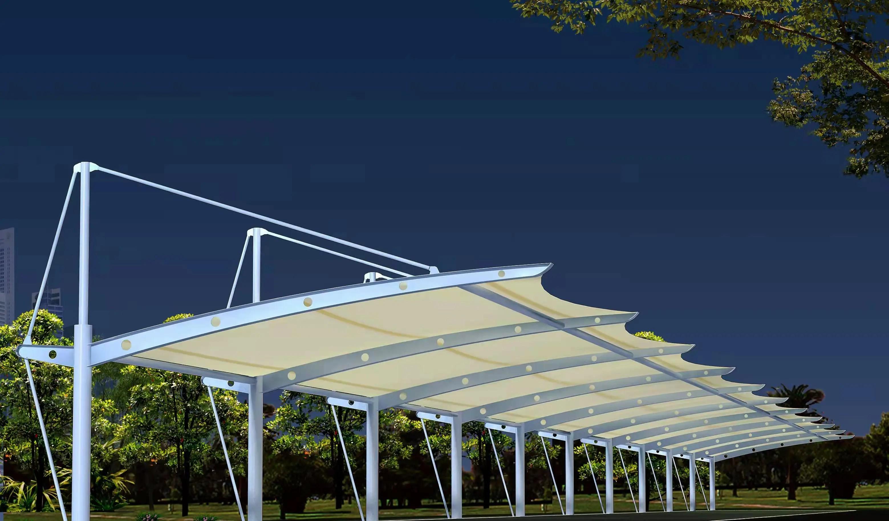 膜结构车棚汽车棚和膜结构车棚停车棚主要用于车辆的停放。它们可以安装在小区、商场、工厂等场所,为车辆提供遮阳、挡雨的保护。膜结构材料具有良好的透光性,即使在车棚内也能保持明亮的光线,方便车主进出。同时,膜结构车棚的结构稳定性高,能够承受一定的风力和积雪压力,保障车辆的安全。