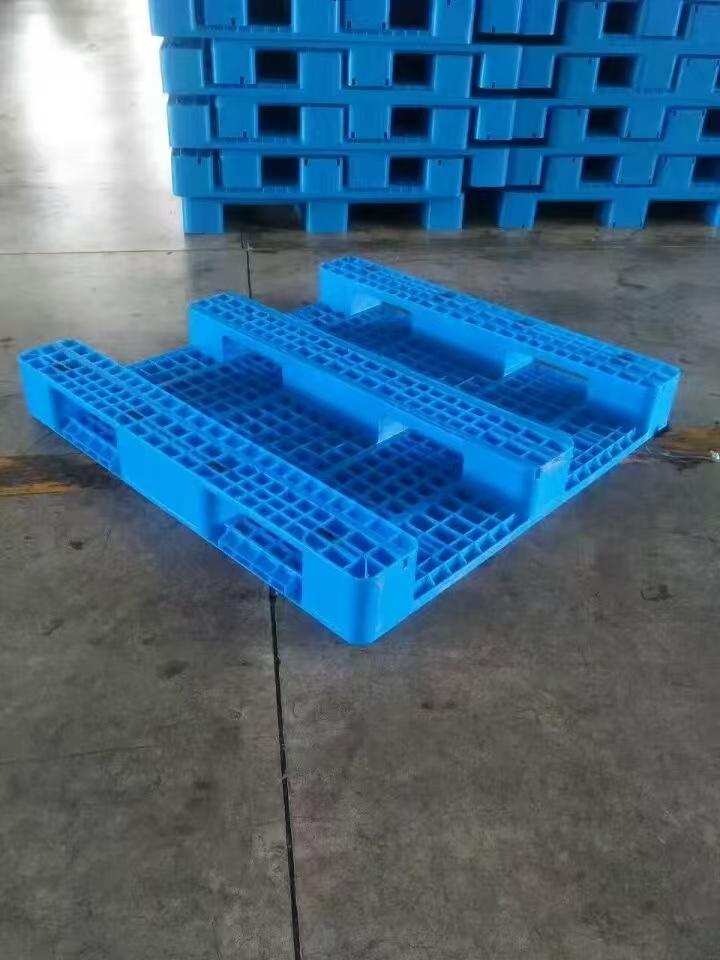 田字塑料托盘因其底部结构呈田字形而得名。田字结构使得托盘的受力更加均匀,具有较好的稳定性和承载能力。它既可以配合叉车使用,也可以用于地面堆垛货物。这种托盘在物流、仓储等行业应用较为广泛,能够有效提高货物的搬运和存储效率。