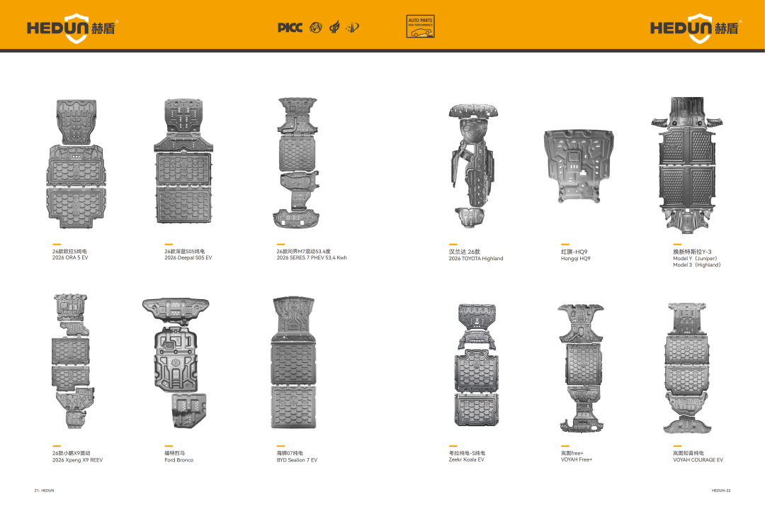 浙江赫盾汽配科技有限公司核心产品为汽车底盘防护系统、发动机下护板、电池护板等。其产品应用覆盖燃油汽车、新能源汽车全品类,适配车型涵盖家用轿车、SUV、MPV、硬派越野、商务车等多种类型,应用领域广泛。客户群体涵盖主流汽车主机厂、汽车 4S 店、连锁维修企业、汽车改装门店、汽配经销商及终端车主,积累了大量优质客户案例与成熟应用经验。