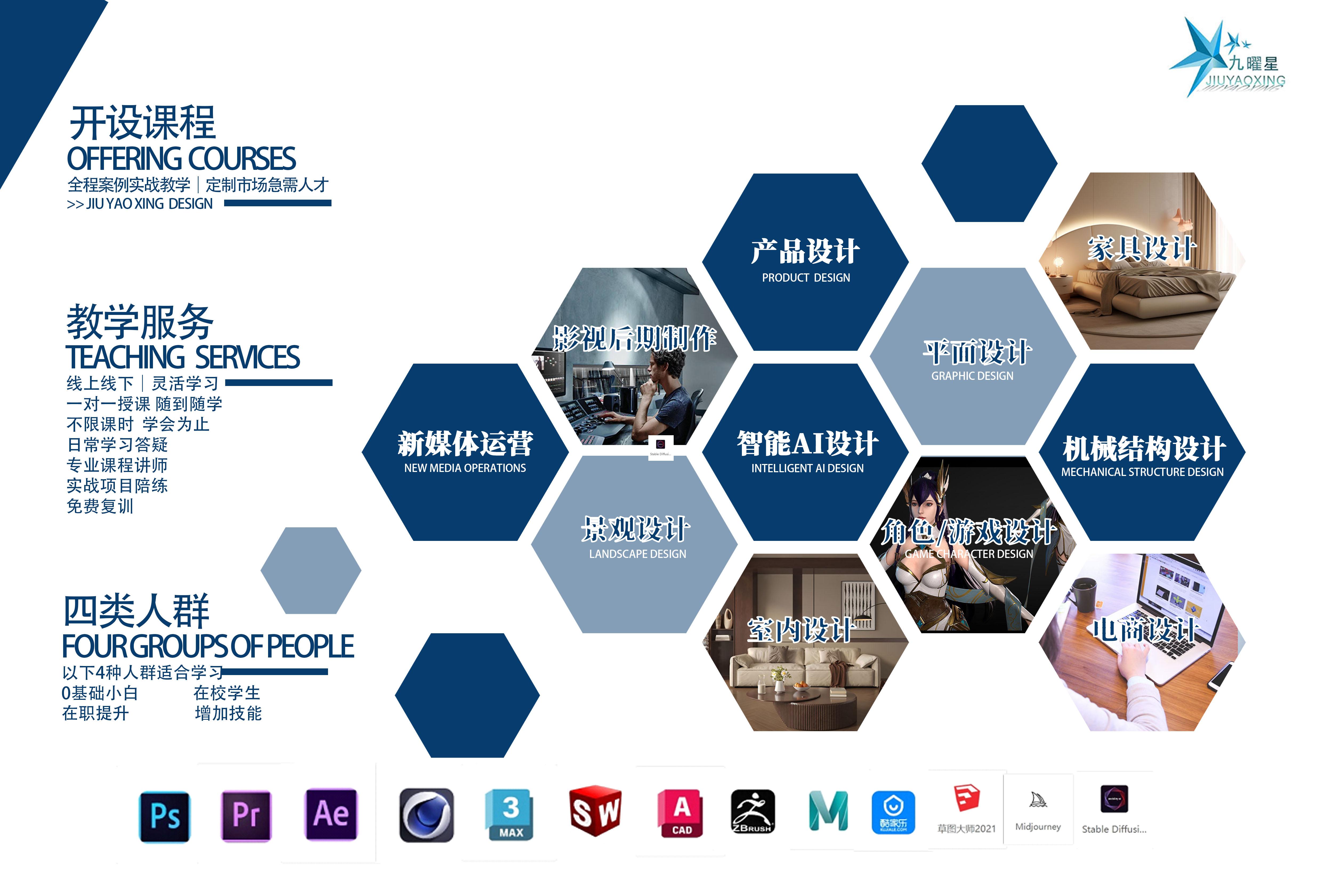九曜星文化传媒自成立以来,便以“设计人才全周期培育”为核心使命,在佛山深耕布局桂城、乐从、南庄、龙江、大良5大校区,并拓展中山市场,设立**教学点——中山校区。该校区落址中山职业技术学院沙溪纺织服装学院内,借势学院优质教学环境、完备设施及深厚纺织服装产业底蕴,与佛山各校区形成联动,共同构建起覆盖智能AI设计、家具设计、影视后期、新媒体运营等12大前沿领域的一站式培训生态。