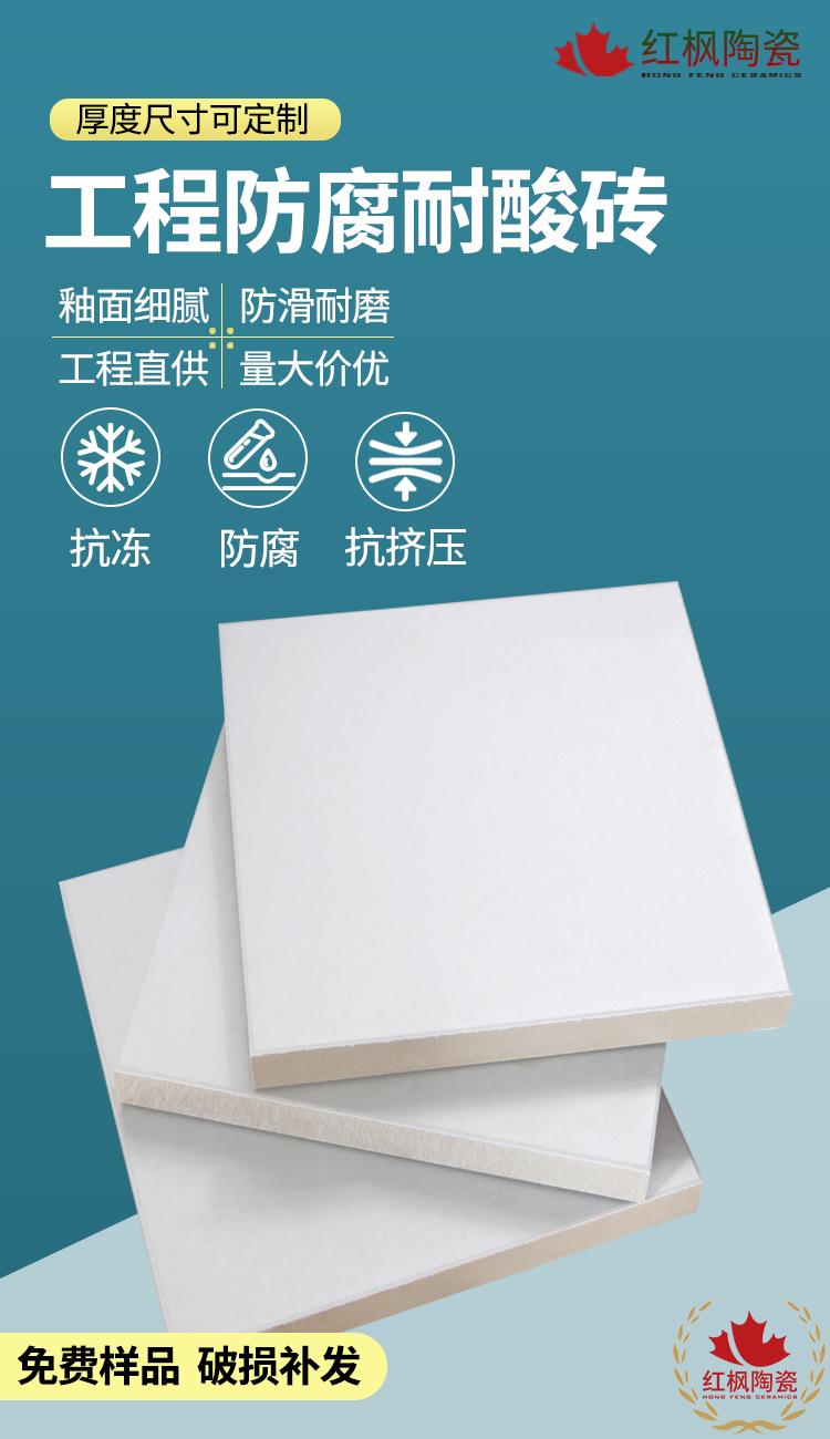 其中,红枫耐酸砖具有高强、抗冻、耐磨、耐化学腐蚀、易清洁、寿命长等特点,以其高强度,全瓷化,无色差,低吸水率的优势,立足河北省,热销全国,还可进行出口贸易,广受经销商及用户好评。其产品类型包括釉面耐酸砖、素面耐酸砖、超白耐酸砖、带孔耐酸砖、防静电耐酸砖、六角耐酸砖、耐酸标砖、碳砖、缸砖、异型砖、耐酸胶泥等,广泛应用于化工厂、电力厂、化纤厂、造纸厂、制药厂、化肥厂、食品厂等场所。