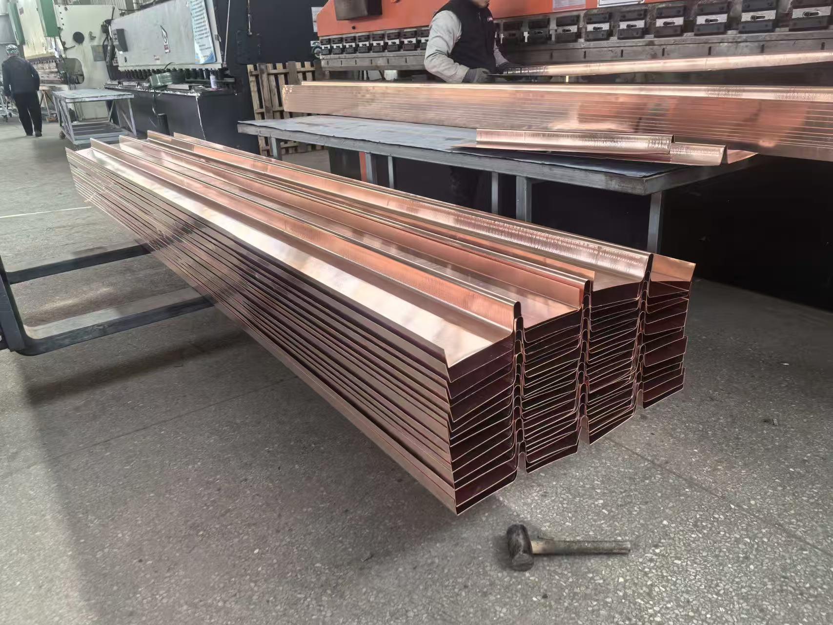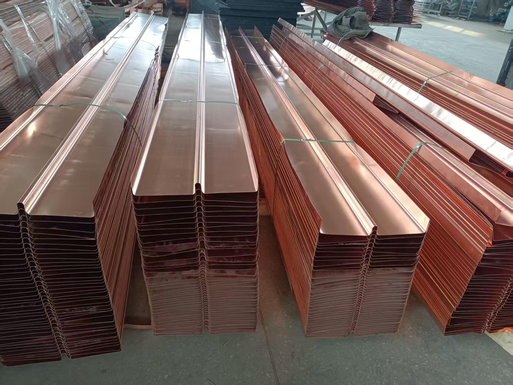 止水铜片常用于水利、建筑等工程的防水部位,依靠其材质特性,在防止水渗透方面发挥着重要作用。常用牌号为 T2、T3 紫铜,铜含量≥99.90%(T2)、≥99.70%(T3),材质延展性好,可适应结构变形,不易开裂。其厚度常规规格为 0.8mm–2.0mm,可按需定制,厚度均匀性偏差≤±0.05mm;宽度常用 200mm–600mm,可根据工程缝宽调整;成型结构包含平板段、止水肋(中肋 / 边肋),肋高一般为 20mm–50mm,肋宽 15mm–30mm,成型规整无翘曲。