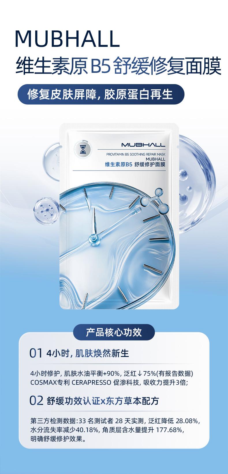 维生素原B5舒缓修护面膜的核心定位为“科学验证的4小时即时修护专家”。它采用“润 - 舒 - 渗”三位一体修护体系,核心成分包括泛醇(维生素原B5)、积雪草、黄芩、甘草等三重东方植萃,并搭载COSMAX专利CERAPRESSO®促渗黑科技,提升成分吸收效率。膜布采用100%天然可降解的可立丝超轻薄膜布(28gsm,厚度0.22mm),透气性佳,贴合度高,且无需珠光膜更环保。产品经33名测试者28天人体功效实测,验证其能快速舒缓泛红、强韧屏障。主打百元内高性价比,是敏感肌、熬夜肌及医美术后人群的安心修护选择。