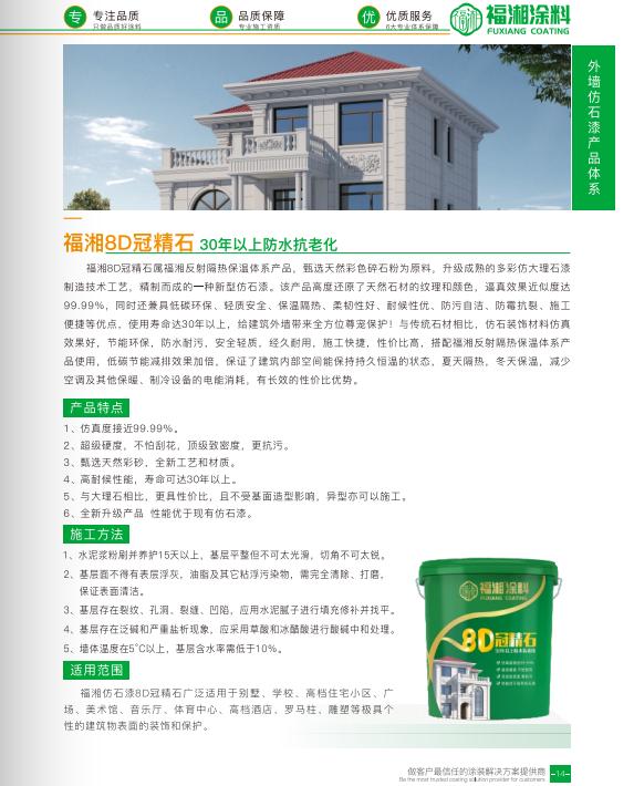 湖南福湘涂料股份有限公司在涂料行业有着不错的口碑。该公司主营多种类型的涂料产品,涵盖了内外墙抗裂涂料、**仿石体涂料、反射隔热保温涂料、气凝胶保温涂料以及真石漆等。其产品广泛应用于小区楼盘、家装别墅、工程项目等多个领域。