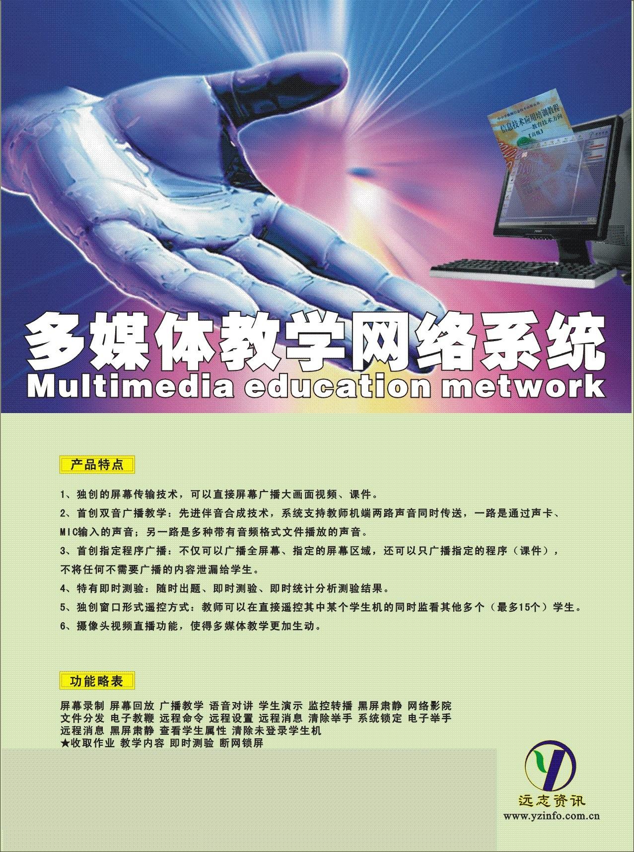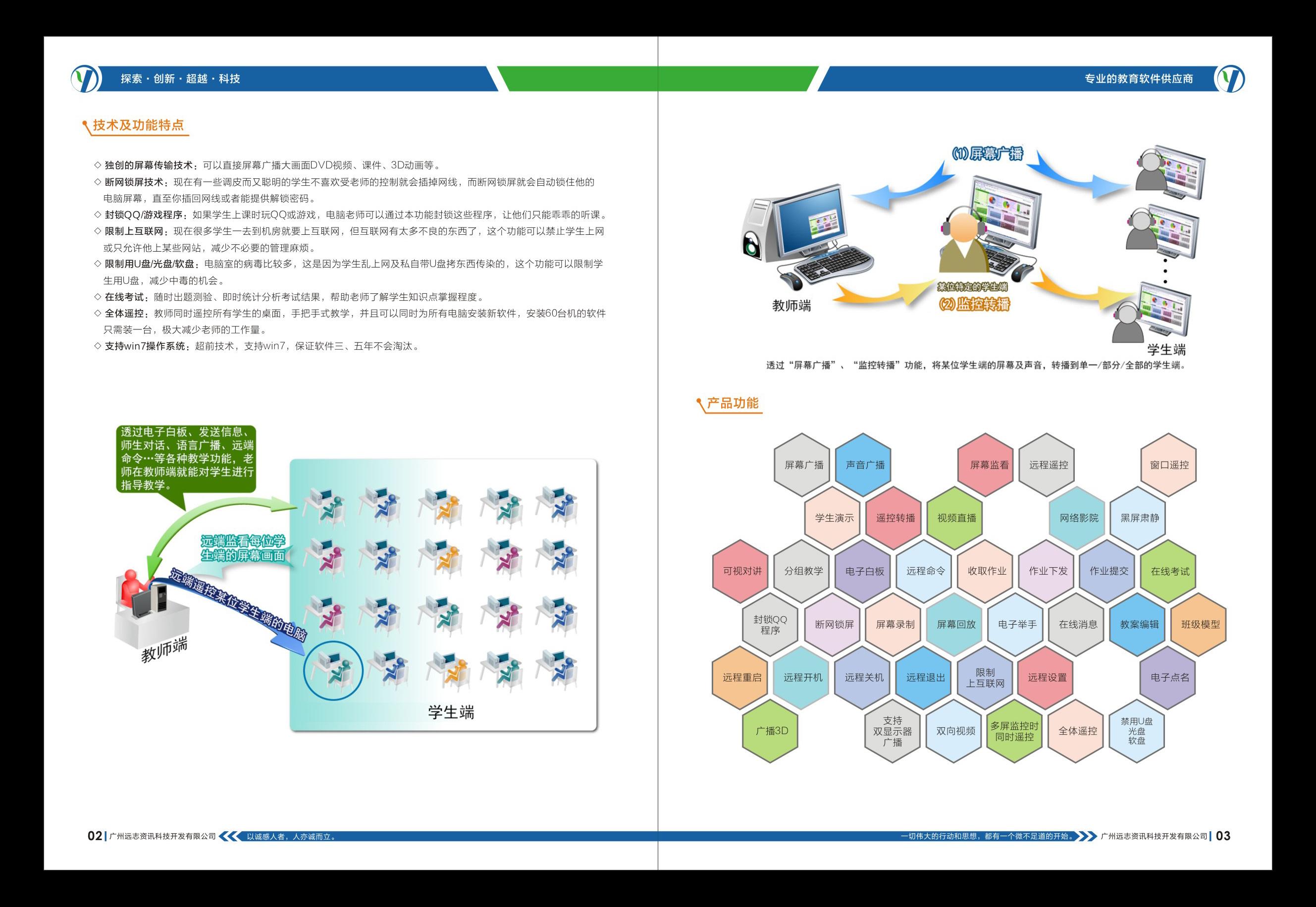 广州远志资讯科技开发有限公司是成立于广州高新技术产业区的高科技公司。目前公司拥有专业化的研发队伍多人,销售及服务网络遍布在全国各地。公司致力于高精技术研发,并以教育行业为主要发展领域,主要核心技术以网络多媒体传输压缩、网络数据信息安全、系统控制、应用技术等为主。