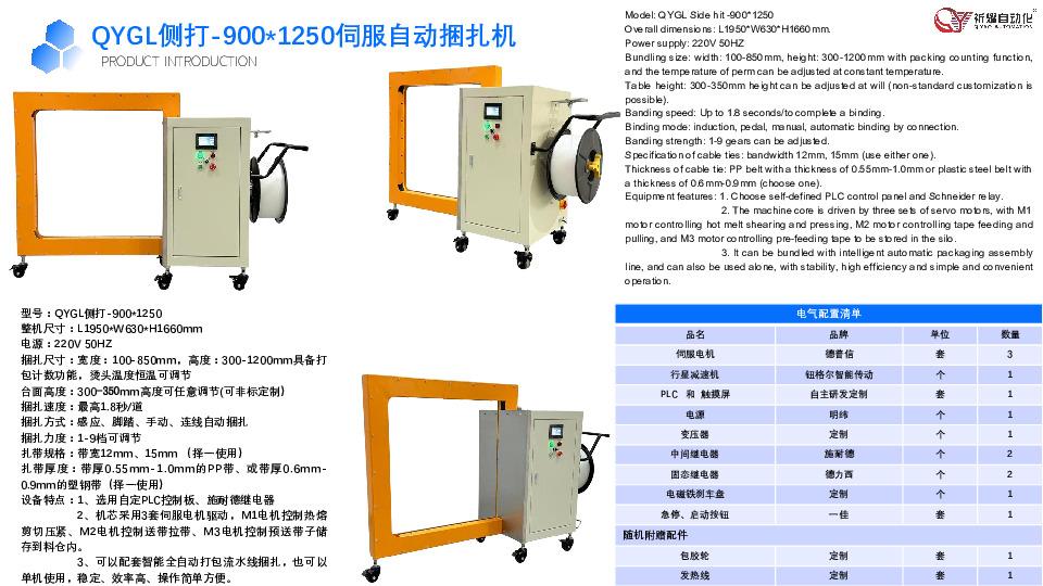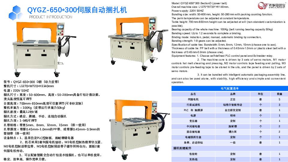 该公司的主营产品丰富多样,核心产品线覆盖伺服自动捆扎机(QYGZ系列)、伺服手动捆扎机(QYGC系列)、侧打/低台专用机(QYGL/QYGH系列)及配套流水线,形成多场景覆盖的产品矩阵。在研发投入上,公司每年将营收的20%以上用于技术创新,拥有独立的研发中心与实验基地,配备国际先进的研发设备与检测仪器,累计攻克30余项行业技术难题,针对不同场景研发出QYGZ - 500*400(小型物料)、QYGZ - 1500*1400(超宽物料)、QYGH低台 - 1250*1000(重型低矮物料)等特色型号,形成多项**核心技术。