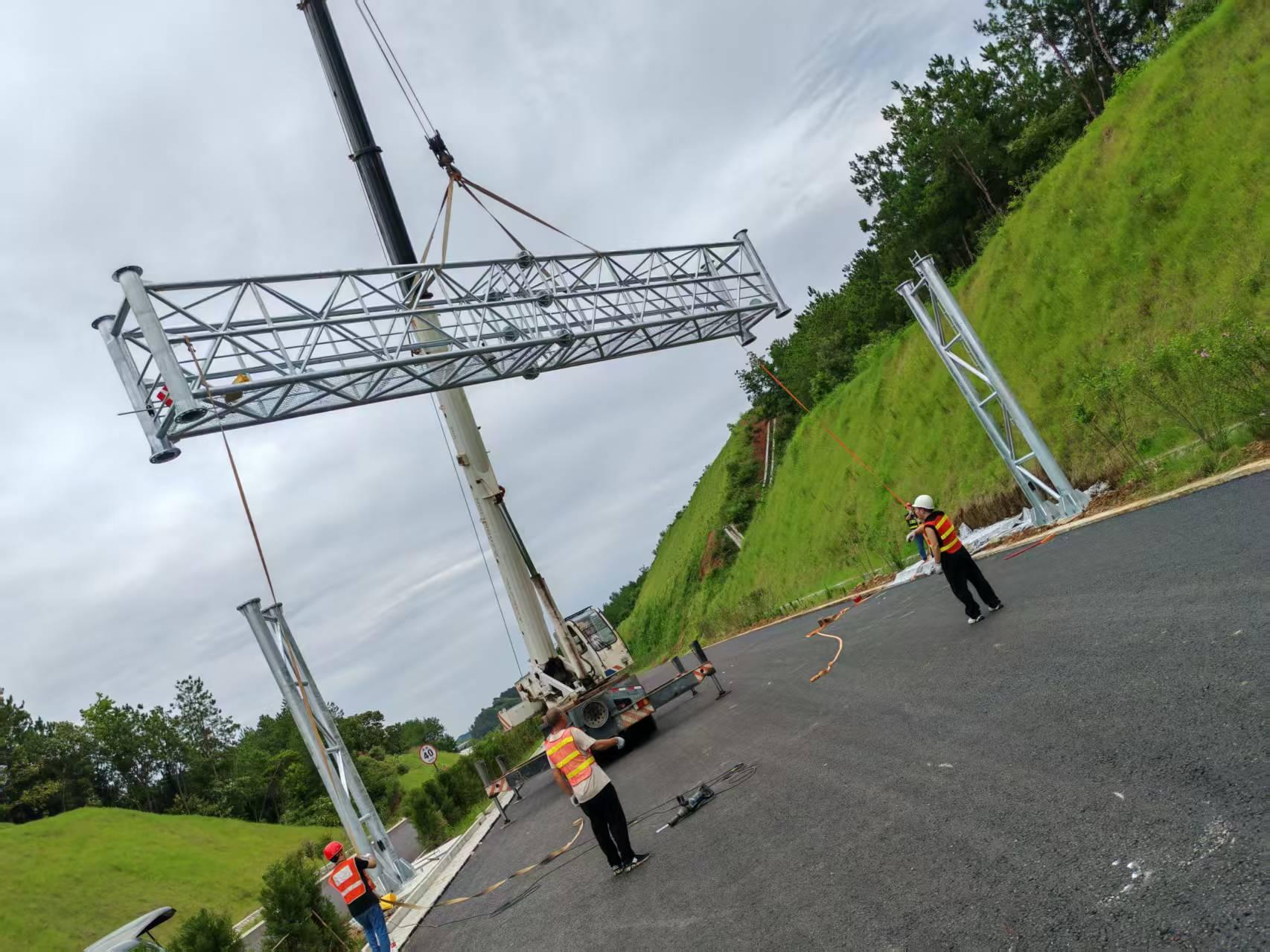 其龙门架同样表现出色。结构安全,大跨度强承重,材质为Q235B/Q355B高强度碳素钢,立柱 / 横梁壁厚6 - 16mm,法兰 / 加劲肋加厚加固,整体刚性强。结构有门式Π型、单 / 双横梁、八棱 / 圆管立柱,跨度8 - 40米,适配双向4 - 8车道高速 / 快速路,净空≥5.5m,满足高速 / 市政规范。经过有限元受力验算,抗风≥12级,抗震设防达标,单跨承重≥500kg,可稳定搭载多块大型标识、ETC天线、监控、补光灯、可变情报板(VMS)。连接采用高强螺栓法兰拼接 + 工厂预制分段,现场吊装快、精度高、无现场焊接隐患。