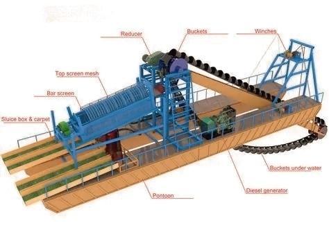 在河道与湖泊水域开采方面,主力设备链斗式淘金船适用于江河、溪流、湖泊等水体中的砂金矿开采,尤其适合处理河床浅层(0–20米)的松散沉积物。设备集成链斗挖掘、滚筒筛清洗、多级分选系统,可连续作业,日处理沙量达300–3000立方米,有效回收粒径小至0.01毫米的微细金粒。在中国南方多沙河流及东南亚、非洲等地的河道项目中均有成熟应用。