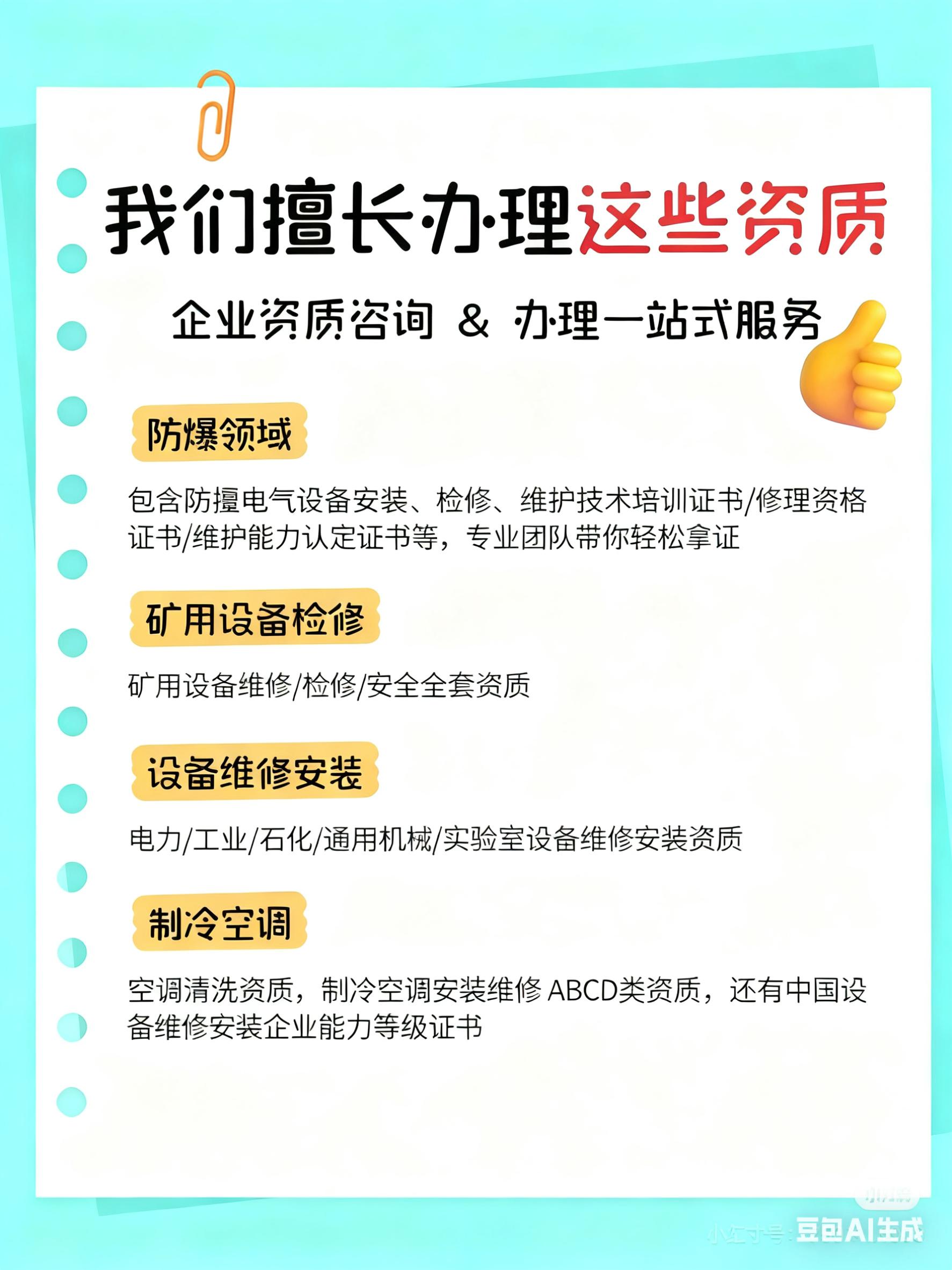 公司业务覆盖范围广泛,主营防爆电气设备安装维修资质、机床维修安装资质、各类阀门相关资质(维修、检修、检测、安装等)及多种设备安装维修资质。同时,还拓展至建筑工程、市政公用工程、机电工程等施工类资质,以及清洗消杀、物业管理等服务类资质,形成了多元化、全方位的资质代理服务体系。