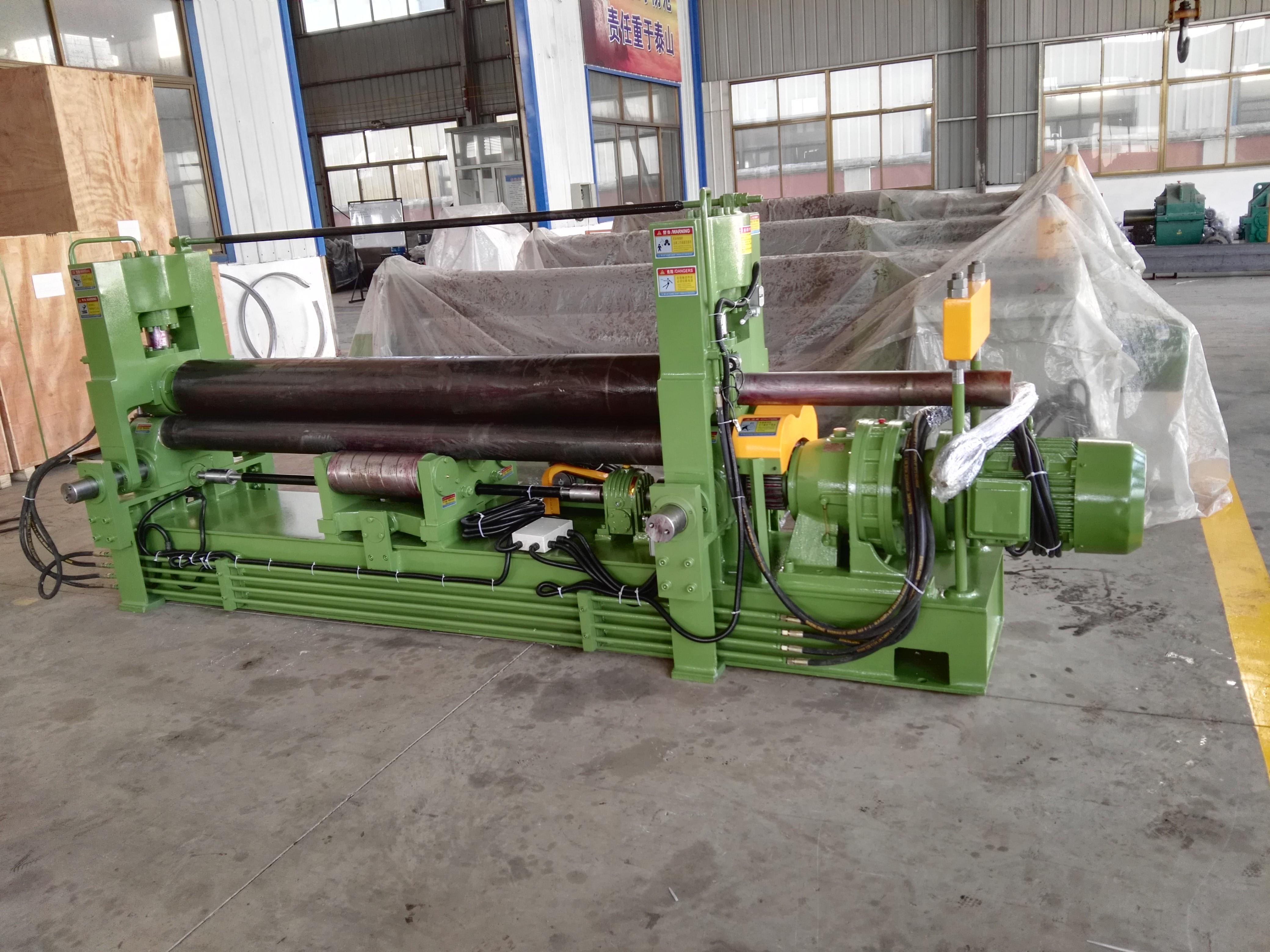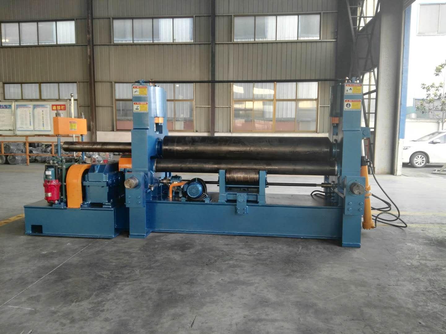 卷板机的工作原理是通过液压力、机械力等外力的作用,使工作辊运动,从而使板材压弯或卷弯成形。以对称式卷板机为例,上辊在两下辊中央对称位置通过液压缸内的液压油作用于活塞作垂直升降运动,通过主减速机的末级齿轮带动两下辊齿轮啮合作旋转运动,为卷制板材提供扭矩。卷板机规格平整的塑性金属板通过卷板机的三根工作辊(二根下辊、一根上辊)之间,借助上辊的下压及下辊的旋转运动,使金属板经过多道次连续弯曲(内层压缩变形,中层不变,外层拉伸变形),产生**性的塑性变形,卷制成所需要的圆筒、锥筒或它们的一部分。该液压式三辊卷板机适用于卷板厚度在50mm以上的大型卷板机,两下辊下部增加了一排固定托辊,缩短两下辊跨距,从而提高卷制工件精度及机器整体性能。