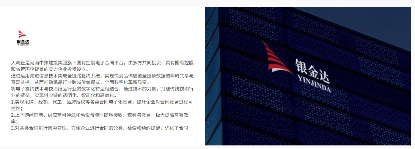 河南大鸿签科技有限公司与河南CA机构、蚂蚁区块链达成合作,实现电子签章合法合规生成与合同全流程上链存证。同时,构建了电子签约全流程服务供应链,从产品技术迭代、平台安全维护到行业解决方案定制、落地交付形成闭环,保障服务标准化与时效性。