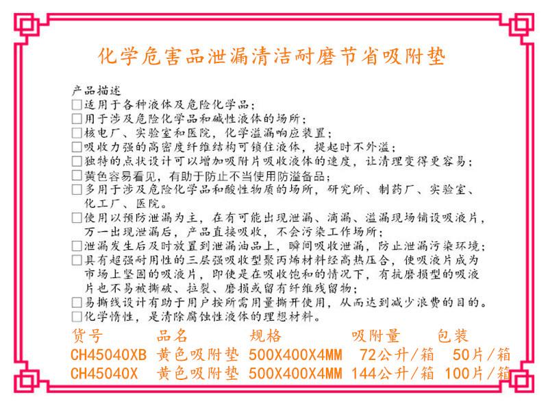 黄色吸附垫通常具有醒目的颜色,便于在工作场所中快速识别。它可以用于特殊液体的吸附,也可以作为一种警示标识,提醒人们注意液体泄漏的情况。