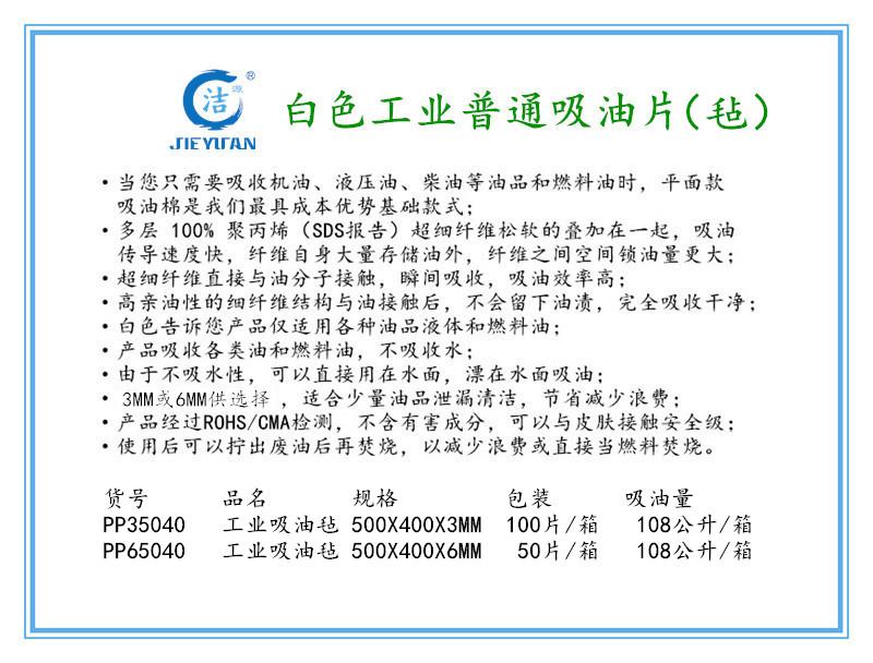 复合吸油毡结合了多种材料的优点,具有较强的吸油能力和耐用性。它可以用于处理各种类型的油污,无论是轻质油还是重质油,都能有很好的吸附效果。复合吸油毡在石油化工、食品加工等行业中得到了广泛的应用。