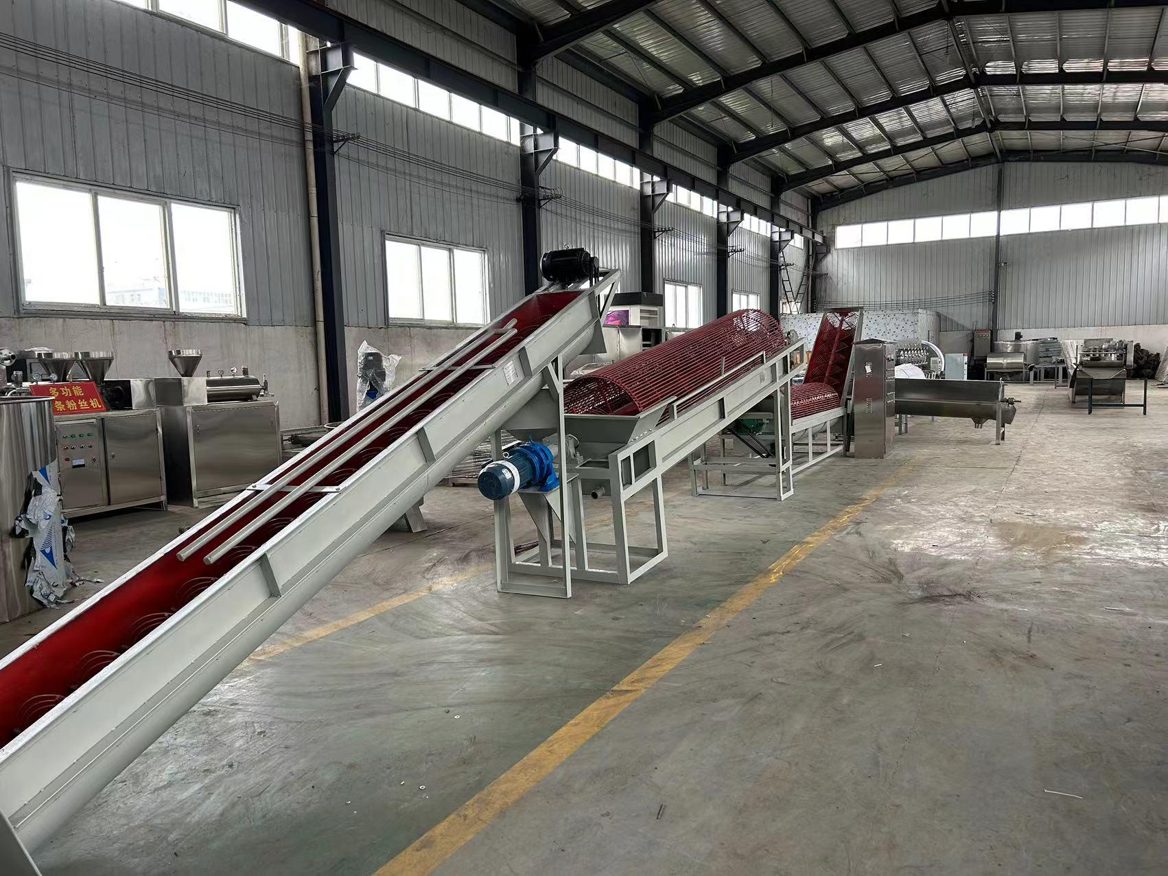 设备核心优势显著。它适配新鲜红薯、红薯薯渣等多种原料,同时可兼容土豆、木薯等其他薯类加工,一机多用,提升设备利用率;采用不锈钢材质,耐腐蚀、易维护、使用寿命长,加工过程无二次污染。在工艺方面,严格遵循各工序核心原理,清洗环节可彻底去除红薯表皮泥沙及表皮,保障淀粉品质;破碎环节可破坏红薯组织结构,释放游离淀粉,提升出粉率;筛分环节以水为介质,分离薯渣与淀粉浆水;除沙精化采用旋流除沙原理,结合比重分离,去除泥沙杂质并精制淀粉;浓缩环节分离淀粉与水、蛋白及细小纤维,提升淀粉浓度;脱水环节去除浓缩/沉淀后淀粉多余水分,为干燥做准备;干燥采用气流干燥工艺,瞬间完成干燥,避免淀粉糊化或降解,保障淀粉品质。整体淀粉提取率高,成品色泽洁白、细腻,符合食用级标准,适配食品加工、餐饮供应链、批量零售等多领域B端应用场景。