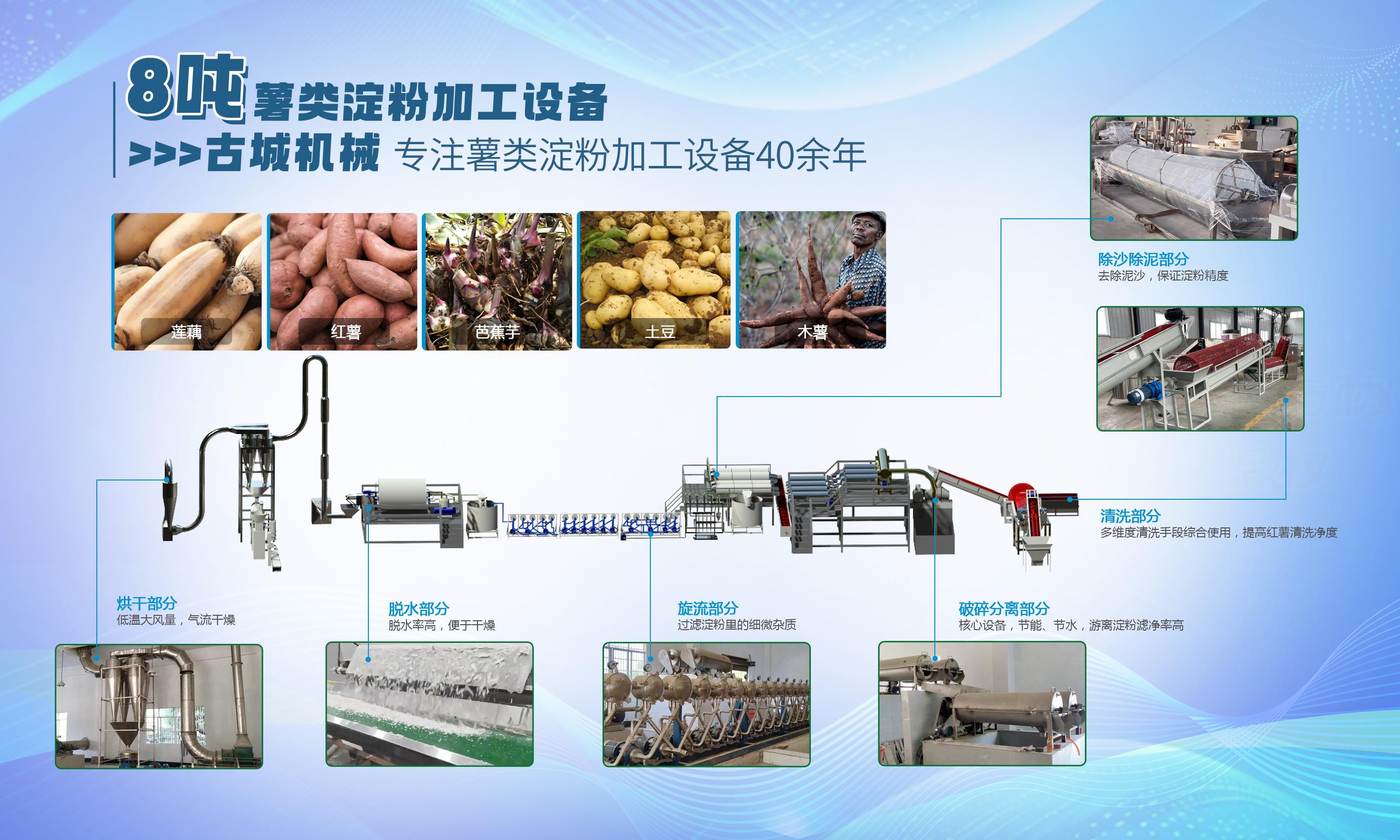 设备核心优势显著。适配新鲜红薯、红薯薯渣等多种原料,同时可兼容土豆、木薯等其他薯类加工,一机多用,提升设备利用率;采用不锈钢材质,耐腐蚀、易维护、使用寿命长,加工过程无二次污染。在工艺方面,严格遵循各工序核心原理,清洗环节可彻底去除红薯表皮泥沙及表皮,保障淀粉品质;破碎环节可破坏红薯组织结构,释放游离淀粉,提升出粉率;筛分环节以水为介质,分离薯渣与淀粉浆水;除沙精化采用旋流除沙原理,结合比重分离,去除泥沙杂质并精制淀粉;浓缩环节分离淀粉与水、蛋白及细小纤维,提升淀粉浓度;脱水环节去除浓缩/沉淀后淀粉多余水分,为干燥做准备;干燥采用气流干燥工艺,瞬间完成干燥,避免淀粉糊化或降解,保障淀粉品质。整体淀粉提取率高,成品色泽洁白、细腻,符合食用级标准,适配食品加工、餐饮供应链、批量零售等多领域B端应用场景。