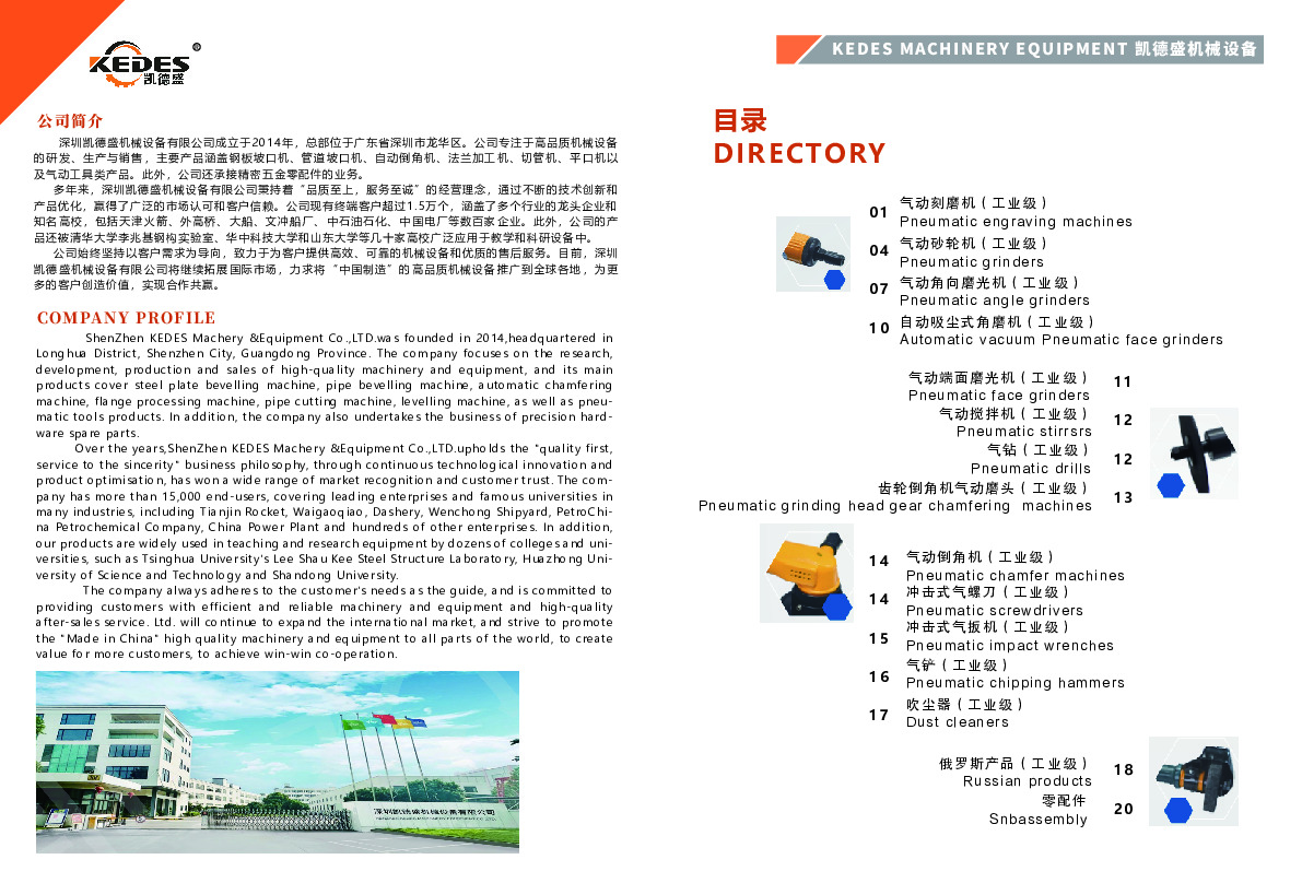 深圳凯德盛机械设备有限公司专注于焊接辅助加工设备、工业级气动工具、金属表面处理设备及工业级零配件的研发与生产。主营产品包括坡口机、切管机、倒角机等焊接辅助加工设备;气动刻磨机、气动砂轮机等工业级气动工具;平面去毛刺机、砂光去毛刺一体机等金属表面处理设备;以及各类工业级零配件。