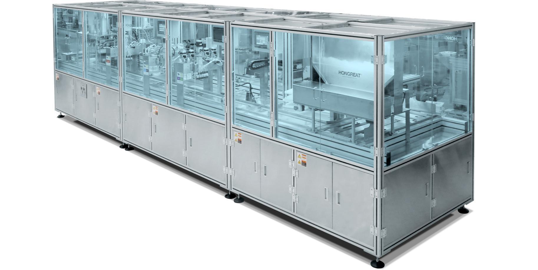 其次是模块化采血管流水线。它同样用于一次性使用真空采血管和非真空采血管的组装。该设备采用模块化结构,具有灵活且占地面积小的特点,尺寸仅约4.2*2.5米。模块化结构可选取其中任一功能,后期亦可随时增加任一功能,适用于新投产采血管的客户。其设备功能包括自动贴标(未贴标试管自动剔除),自动装夹具,倒管检测,药剂添加(EDTA,促凝剂,枸橼酸钠,肝素,氟化钠,草酸钾),药剂烘干,加帽,真空压塞,装泡沫托盘等。