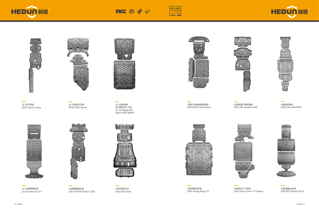 在售后与改装市场,赫盾产品覆盖国内外数千款主流车型,包括比亚迪、长城、小鹏、理想、问界、特斯拉、丰田、本田、宝马、奔驰、奥迪等品牌。该公司同步跟进新车型上市节奏,快速推出适配护板,满足不同用户需求。针对家用车主,产品提供基础防护,延长车辆使用寿命;针对越野爱好者,产品采用高强度材质与加固设计,具备超强抗冲击、防拖底能力,适应复杂越野路况;针对新能源车主,产品精准覆盖电池、电机、电控等核心部件,提升用车安全性,消除底盘剐蹭隐患。
