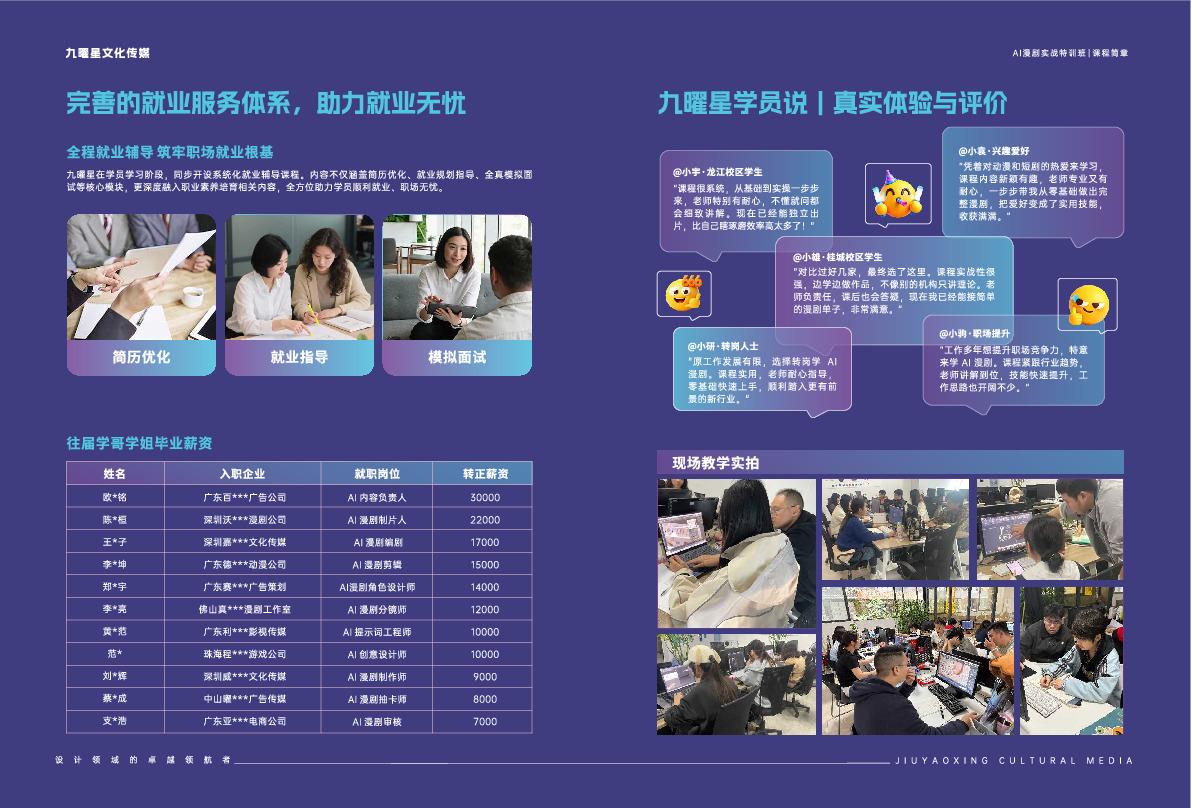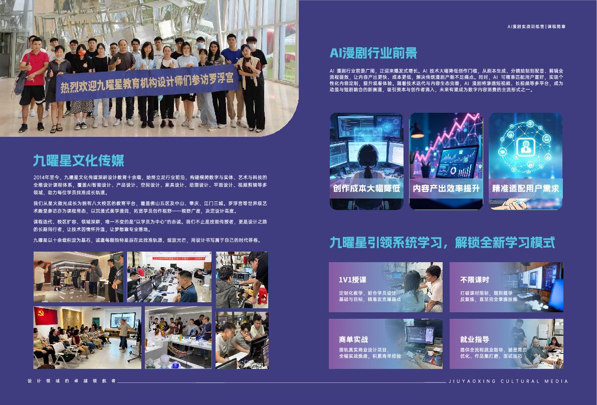 九曜星文化传媒自2016年启航,以“设计人才全周期培育”为核心使命。在佛山深耕布局了桂城、乐从、南庄、龙江、大良5大校区,还拓展了中山市场,设立了**教学点——中山校区。该校区落址中山职业技术学院沙溪纺织服装学院内,借助学院优质教学环境、完备设施及深厚纺织服装产业底蕴,与佛山各校区形成联动,共同构建起覆盖智能AI设计、家具设计、影视后期、新媒体运营等12大前沿领域的一站式培训生态。