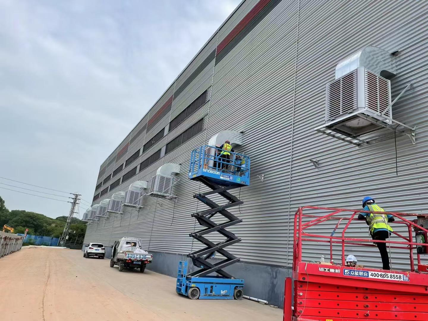 再如CNC车间通风降温方案,为了提高车间的工作环境,对车间进行通风降温系统改造 ,工业冷风机为模具生产车间舒适降温通风,主机安装在模具车间室外不仅仅可以将外部空气经过湿帘水蒸发变成新鲜冷风与室内空气形成对流,达到通风、降温、换气、除味的效果,而且可以把门窗打开,将室内的粉尘异味通过对流排出。除此之外,工业冷风机还可以对员工岗位进行局部送风,每台平均可覆盖面积100㎡,1小时仅需1度电。还有钢结构厂房通风降温方案,通过安装环保空调(冷风机)以及工业大风扇组合,使整个车间闷热以及不通风的的状况得到更大的改善,车间内温度由平均40度的环境降温到30度,员工的工作效率大大的提高,整体工作环境清凉舒适,车间的气味得以排出。家具厂房降温方案中,对于家具厂的降温问题,强烈推荐车间环保空调,其在提供降温的同时,还能通风,换气,保持室内空气的清新度;车间安装环保空调,投资成本较低,相同的使用面积下,比装费用只有中中央空调 的五分之一左右;环保空调的使用成本低,相比中央空调,使用环保空调的耗电量更低,按照车间的使用面积每100平方米安装一台环保空调KD1818A,功率大约为1.1Kw,每小时耗电1度,而使用中央空调的话,每100平方米大约需要2台5P的空调,功率大约8Kw,每小时需耗电8度;环保空调降温迅速,采用大风量低噪音风叶,每台机送风量大约18000m³/h,可迅速的排出车间内的热空气,降低车间内的温度。