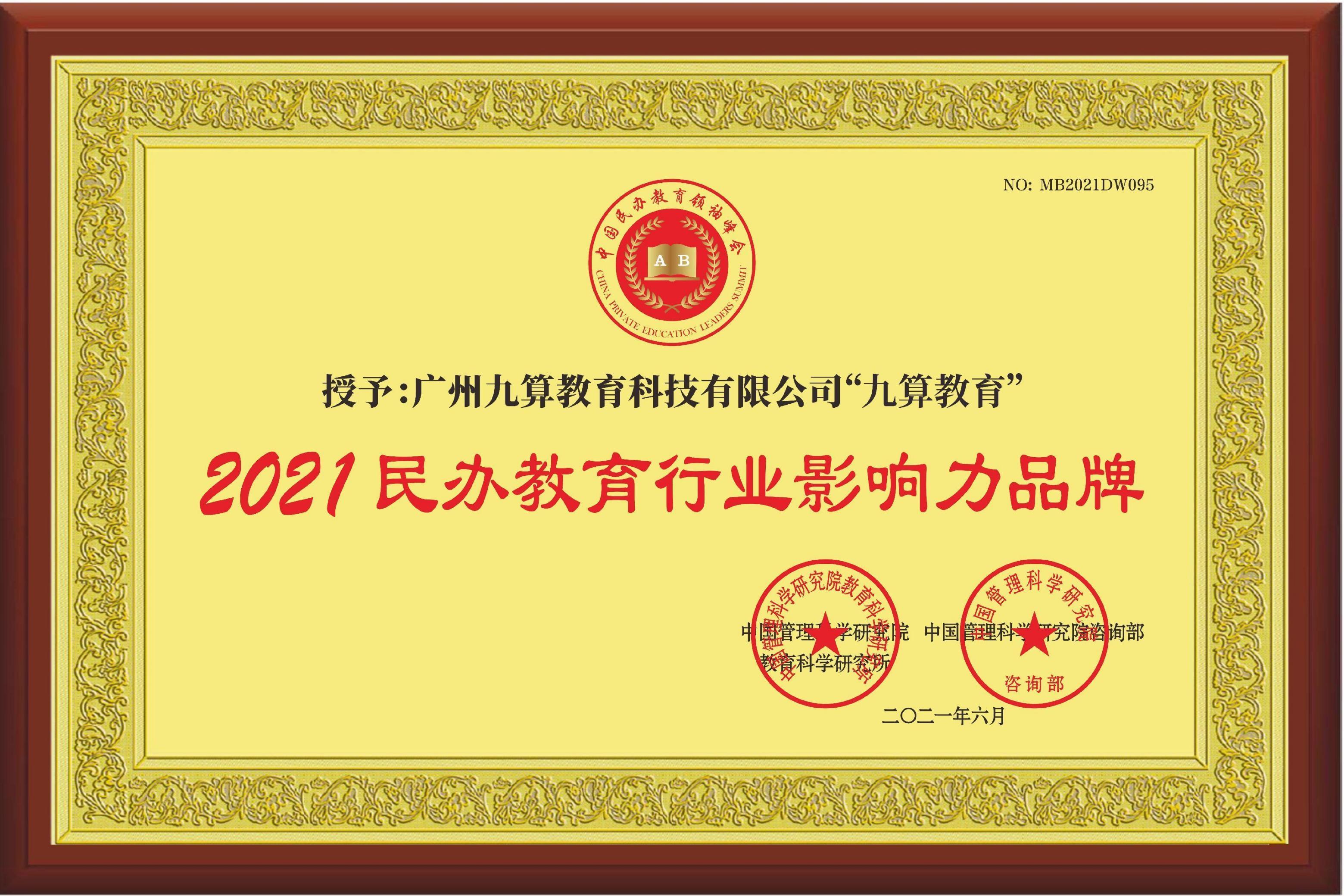 在品牌荣誉方面,九算教育也收获颇丰。它获得了搜狐教育年度影响力教育机构(2020年)、中国民办教育行业影响力品牌(2021年)、全国连锁品牌影响力品牌等荣誉,还是广东省民办教育协会理事单位。