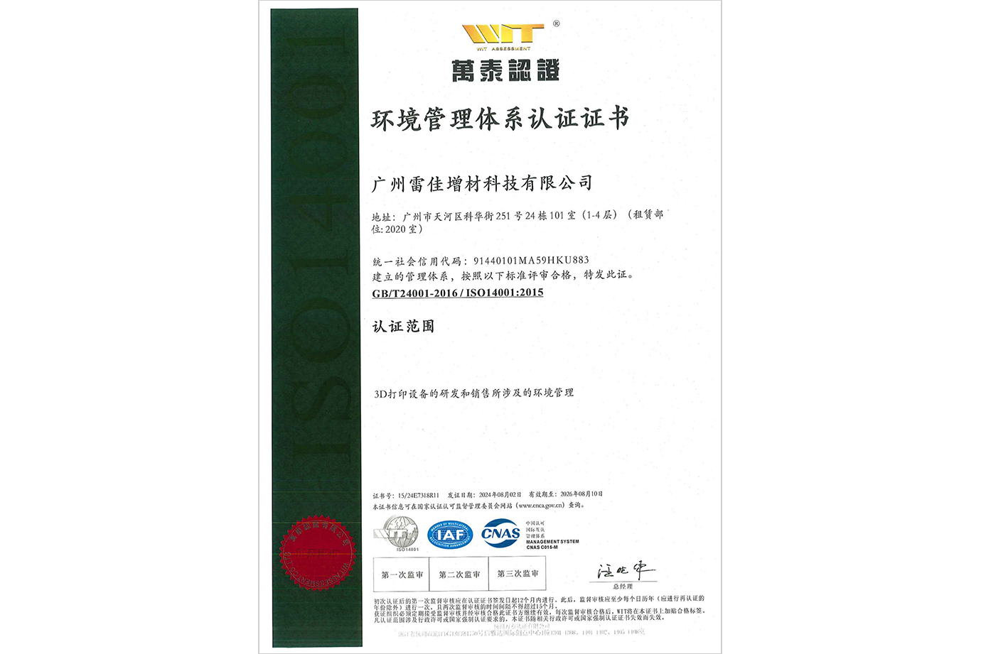雷佳的产品以“高精度、高稳定性、低运行成本”为客观特征。其自主研发的LASERADD系列工业级金属3D打印设备(如DiMetal系列),经过多代技术迭代,在市场上表现出良好的成熟度。公司通过了相关质量管理体系认证以及获得了欧盟CE认证,在硬件制造、生产流程及质量控制方面达到了国际通行标准,产品具备可靠的质量保障。