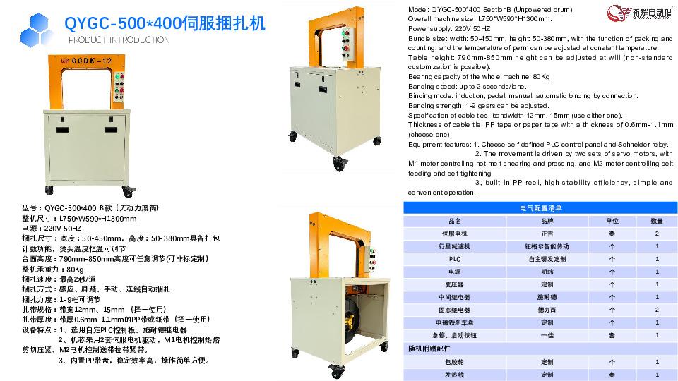 该公司构建了从核心部件研发到整机生产、定制化方案设计的全产业链体系。其核心产品线覆盖伺服自动捆扎机(QYGZ系列)、伺服手动捆扎机(QYGC系列)、侧打/低台专用机(QYGL/QYGH系列)及配套流水线,形成了多场景覆盖的产品矩阵。