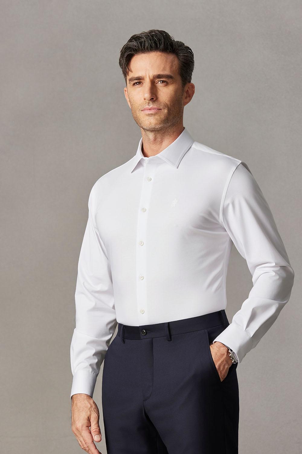 该衬衫具有六大核心优势。其一,采用高弹不束缚面料,精研高针密织弹簧纱,数万次抬手抱臂伸展,不绷不缚不变形。其二,拥有高弹免烫黑科技,经过100次连续水洗测试,持久免烫,9条衣骨平整支撑,衣身360度光滑如新,日省17分钟,12小时全天候平顺。其三,机翼动力学高弹领,0重力回弹定型,领口30度仰角屹立不倒,领座内外弧回弯工艺,牵引领型久穿不外扩,黄金10公分弹力支撑衬,领体百洗不塌。