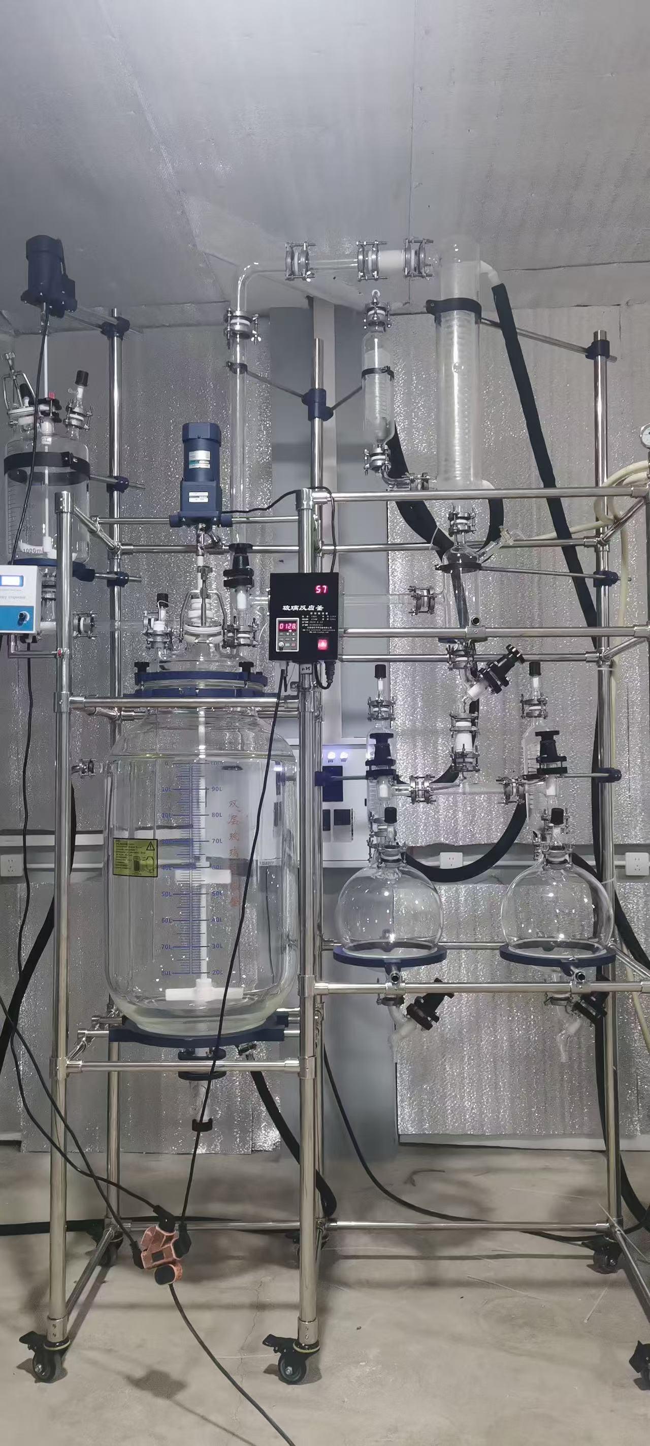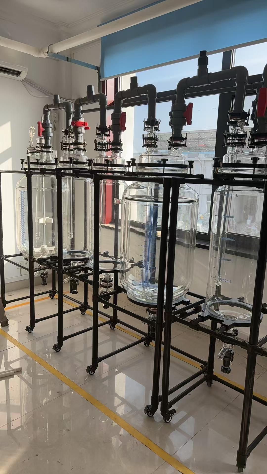 双层玻璃反应釜是该公司的重要产品之一。其与物料接触部分全部采用高硼硅玻璃(膨胀系数 3.3)和聚四氟乙烯材料,性能稳定,不易与物料起化学反应,使用方便安全。框架式主体,采用铝合金 + 不锈钢材质,高效稳定、美观大方、经久耐用。玻璃 + 四氟放料阀门,无积液侧放料,回收溶液十分快捷。低速增力电机,电子无极调速,通过旋扭微调,双显调速盒可数字显示转速和釜内物料温度,性能稳定、清晰显示操控及数据平面、简单易操作。
