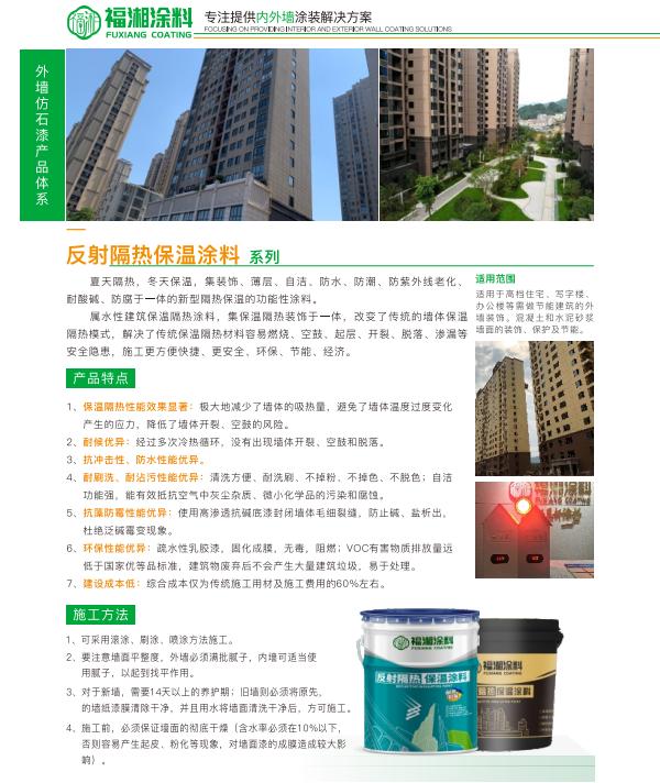 总之,湖南福湘涂料股份有限公司的反射隔热保温涂料、真石漆、气凝胶保温涂料、水包水涂料和**仿石体等产品,都具有各自独特的特点和优势。这些产品在不同的应用领域中都能发挥出重要的作用,为建筑物的美观和性能提供有力的保障。