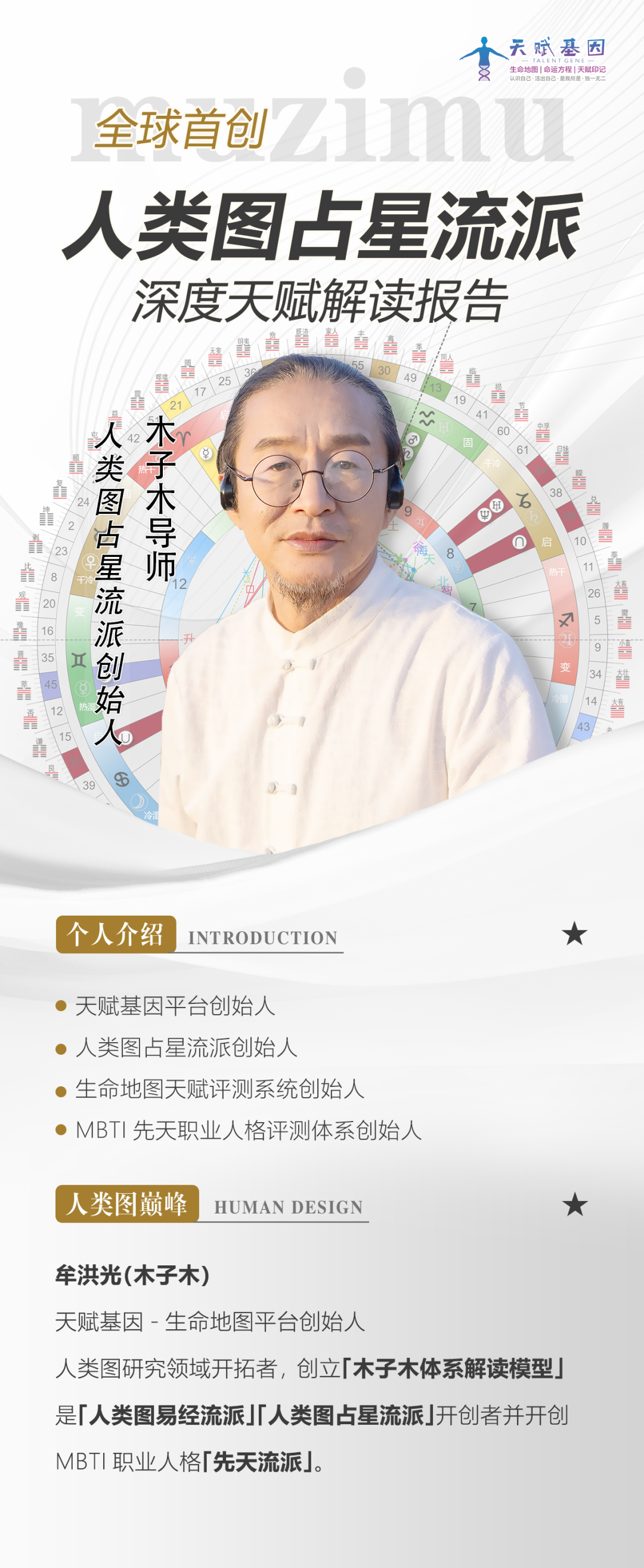 公司创始人木子木老师是生命智慧的传承者与实践者。深入研修人类图体系20年,是国内接触和传播人类图的先驱者之一,精通易经、占星、卡巴拉、脉轮等东西方智慧体系,将四大古老智慧与量子物理、基因科学等现代科学融会贯通,独创‘木子木生命地图学修体系’,包含内观五境、四身六力八维等实修方法,让人类图从认知工具升华为生命成长路径。