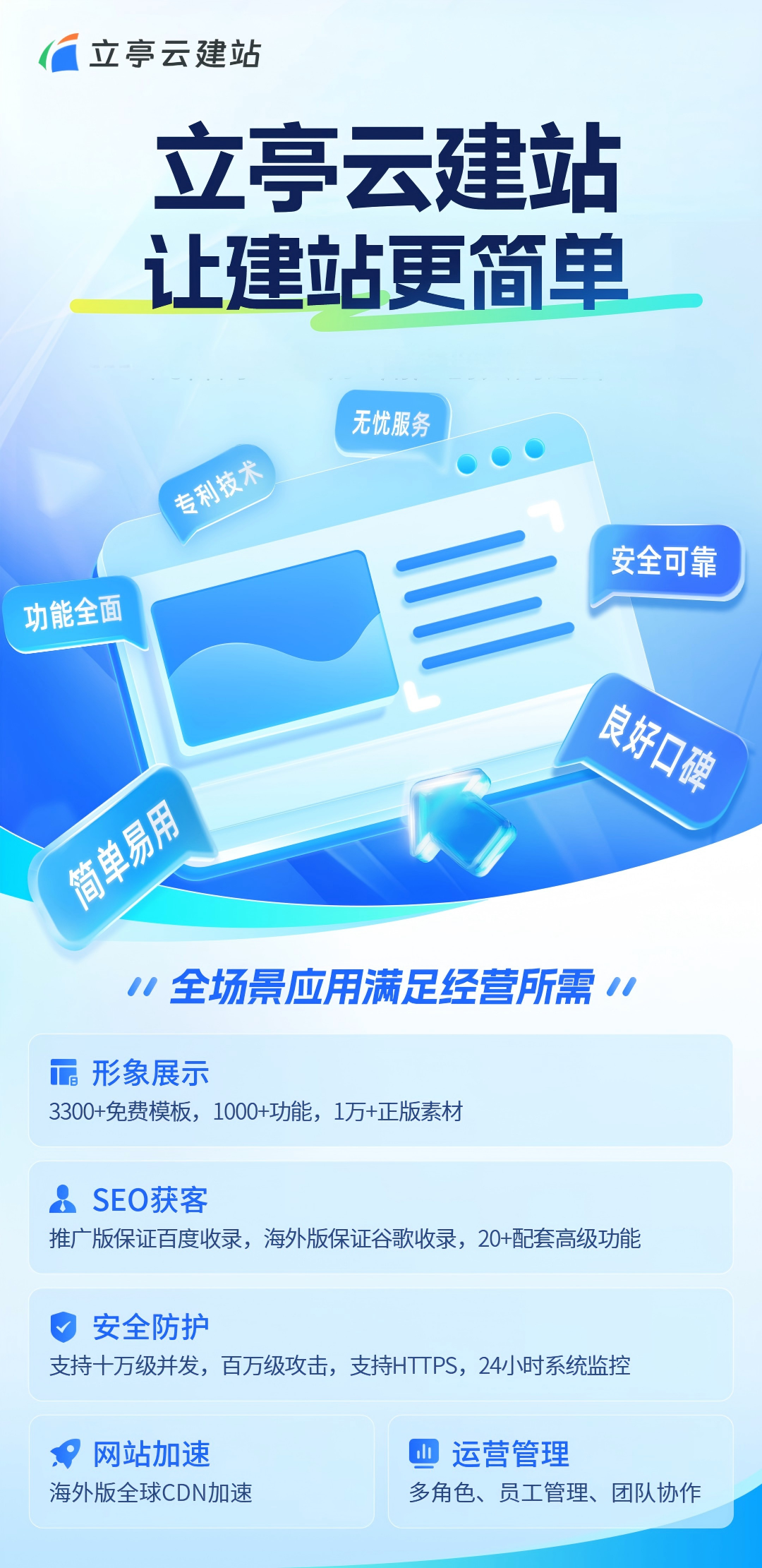 立亭云建站的产品涵盖了建站、商城搭建、互动抽奖、小程序制作、海报制作、门店管理、AI速创、GEO优化、客户管理、在线教育、微传单、公众号助手等。这些产品可以帮助企业打造专业的品牌官网与营销阵地,助力企业塑造专业形象、拓宽获客渠道。